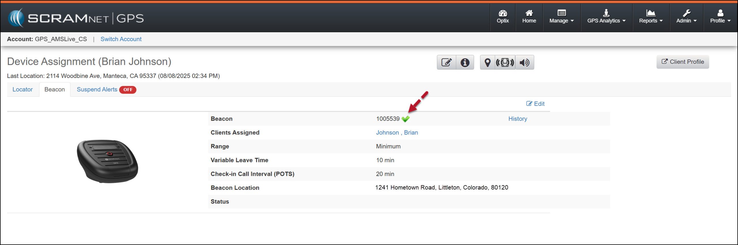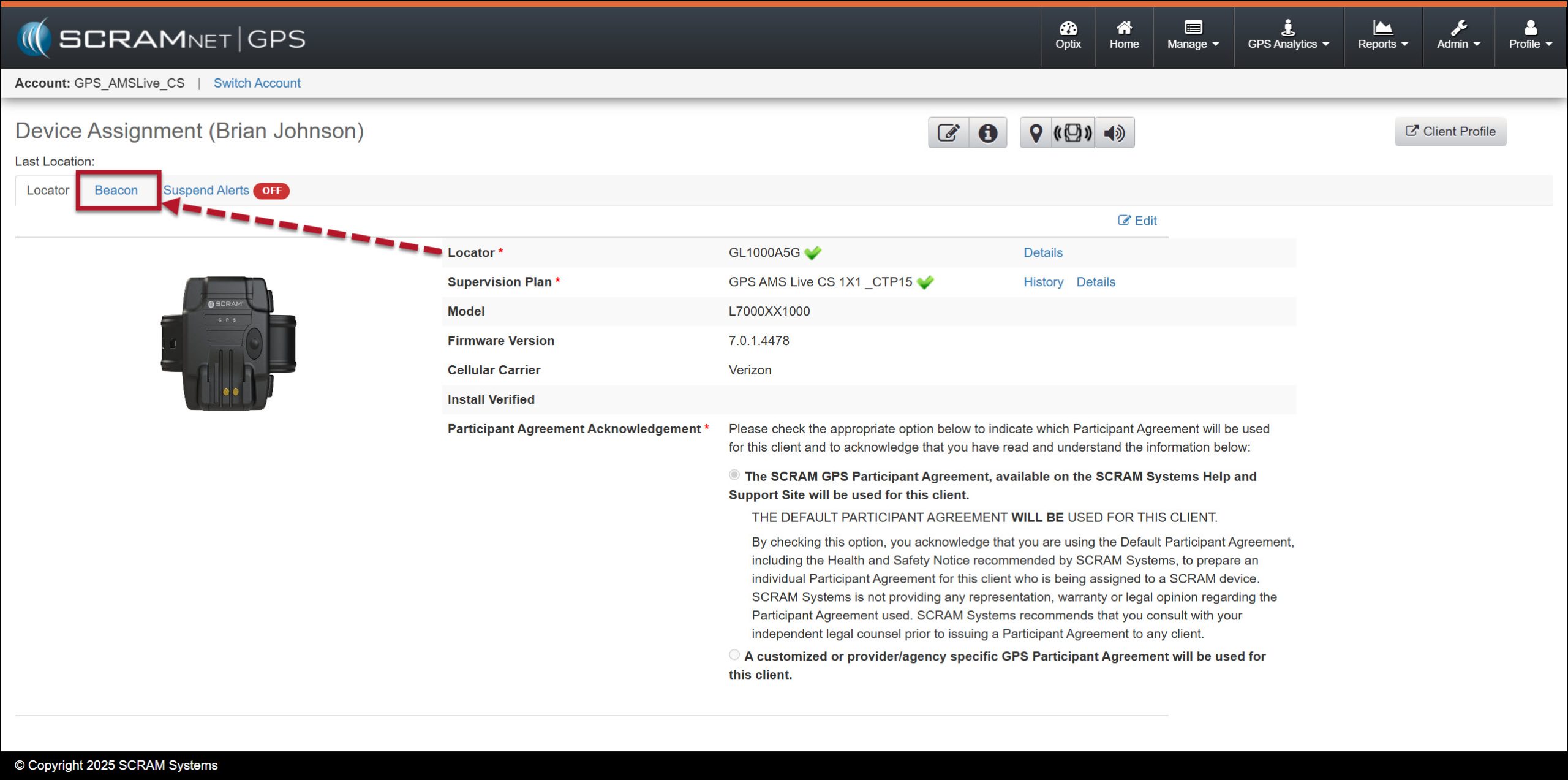 | Most GPS devices with “GL” serial numbers are Beacon-compatible. If you receive a “Beacon Compatibility” warning on a “GL” or “GM” device, your GPS bracelet or Beacon may not be running the latest firmware. Contact SCRAM Systems Customer Support for assistance. |