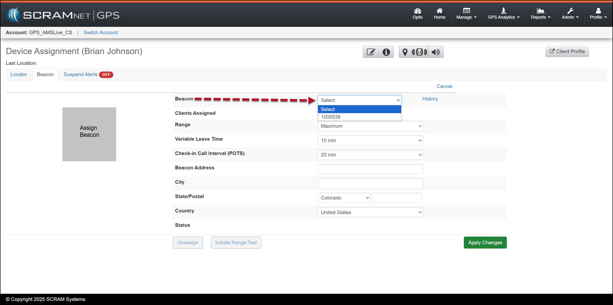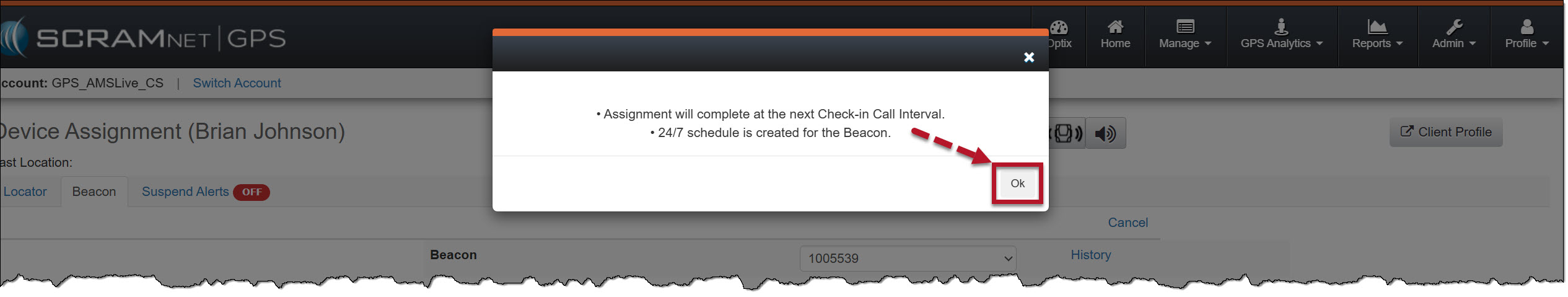 IMPORTANT: SCRAM Systems strongly recommends that beacons be assigned to bracelets in an office environment with an Ethernet or telephone line connection to the internet available, and with the client and bracelet present. |