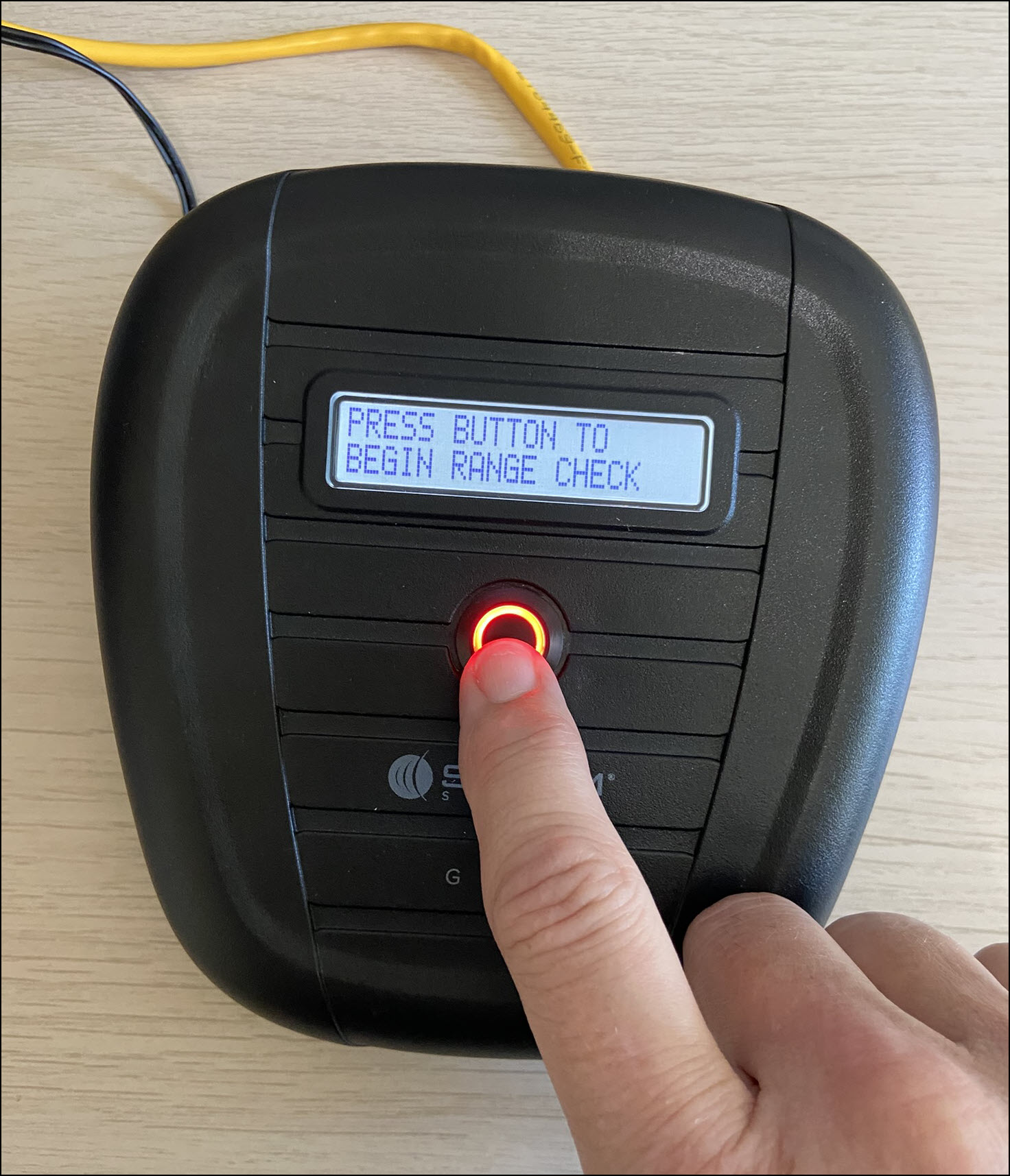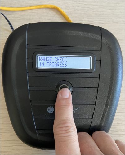 - The screen on the beacon will update to “Press Button to Begin Range Check,” and the center button will flash red. Press the flashing red button.