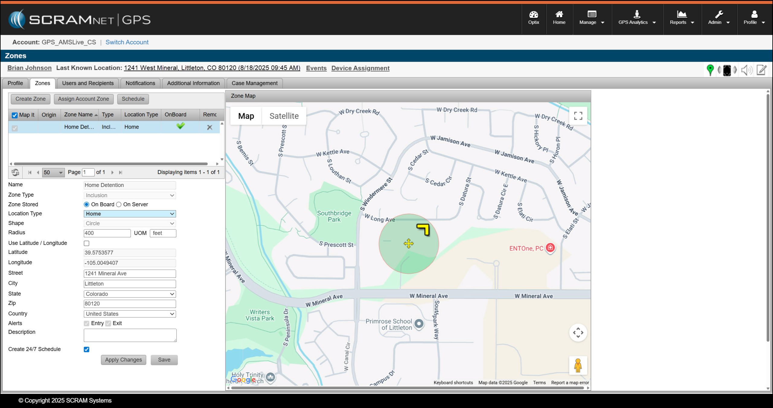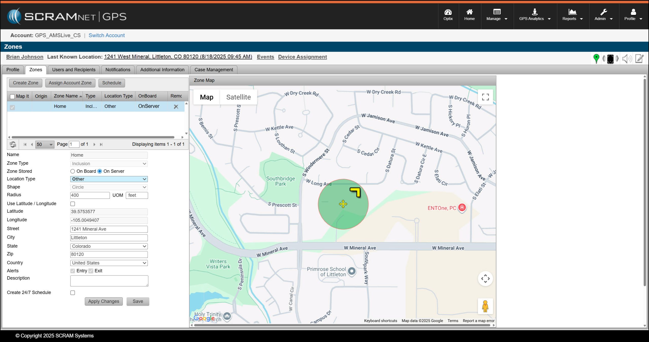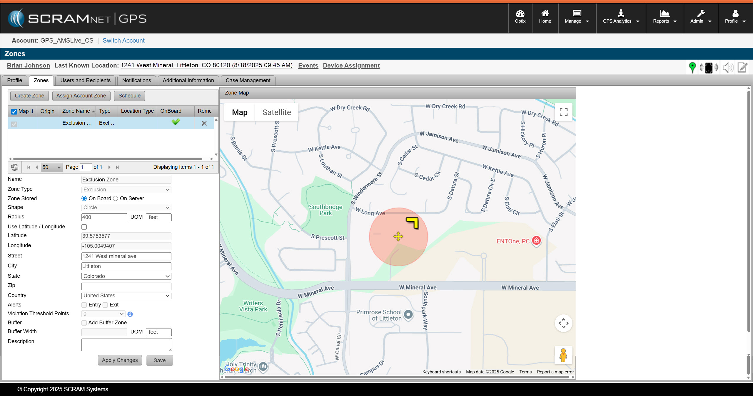 Once you have established the zone, select the Satellite button on the map to verify the placement of the zone. Make any adjustments as needed. SCRAM Systems recommends that the crosshairs on the zone be positioned in the center of the zone’s location. After making any adjustments, select the Apply Changes button.