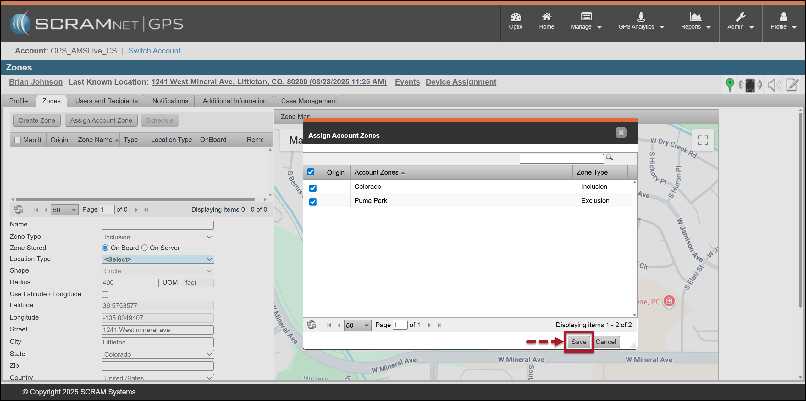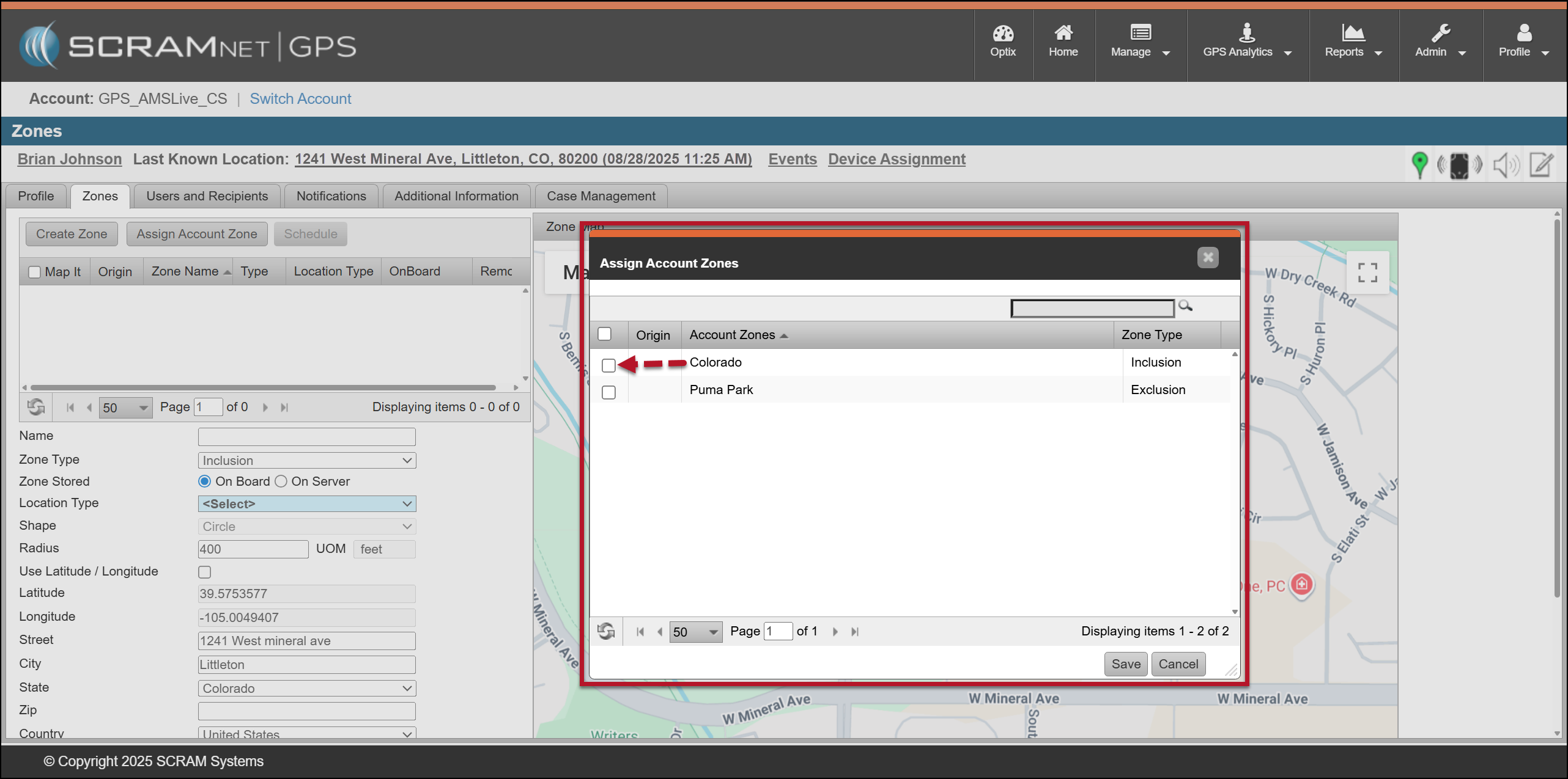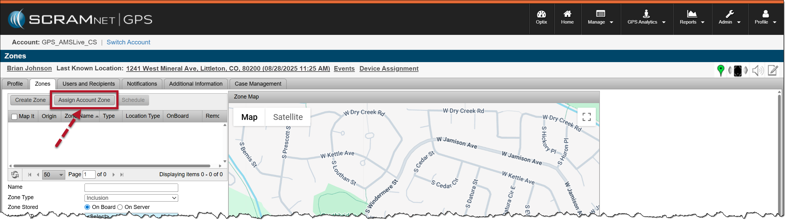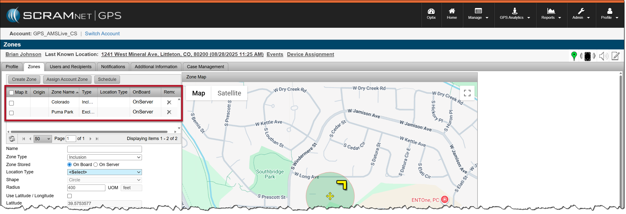 An Account Zone is a zone frequently used across your entire program, such as your state, the courthouse, parks, or schools. Account Zones may be Inclusion, Exclusion, or Neutral Zones, and may be circular, square, or polygonal shapes. They are saved as an On-Server Zone for the client. These pre-built Zones are created and saved by an administrator of your program.