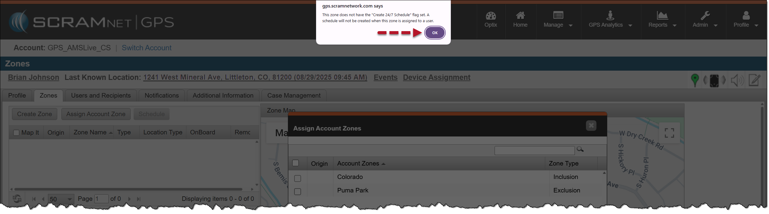 - When selecting an Account Zone that was not pre-built with a 24/7 schedule, you will need to acknowledge the warning pop-up window by selecting the OK button and then add a schedule to that zone. Step-by-step instructions are in the available in the Zone Schedules article.