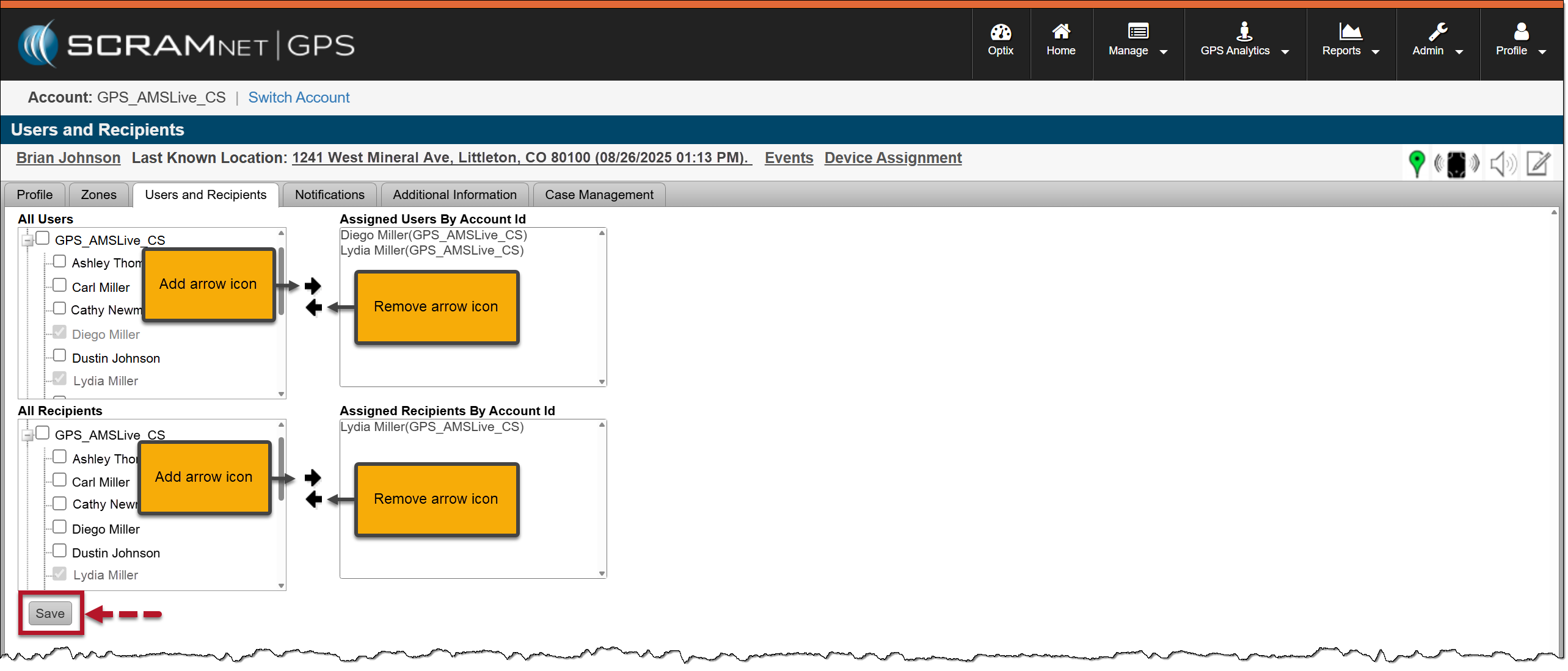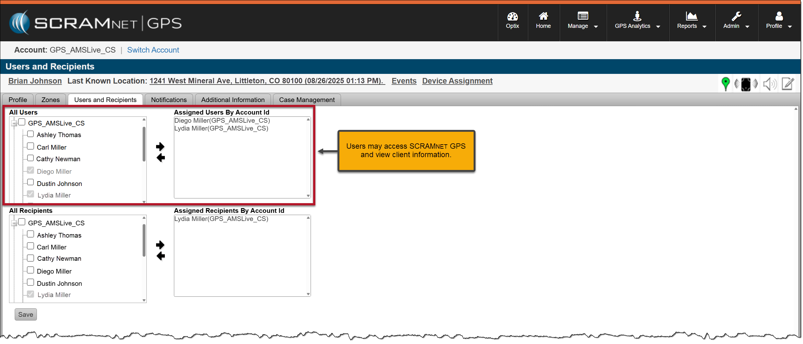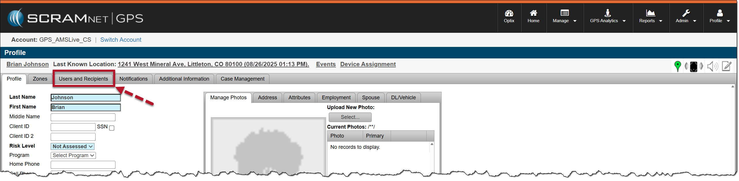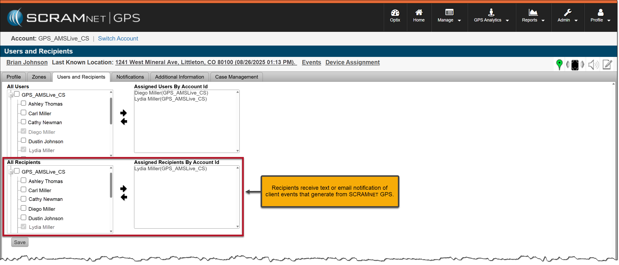 When setting up a client for monitoring in your program, always verify that the correct Users and Recipients are associated with the client. This ensures the proper people have access to the client’s profile in SCRAMNET GPS, as well as those to whom event notifications will be sent.