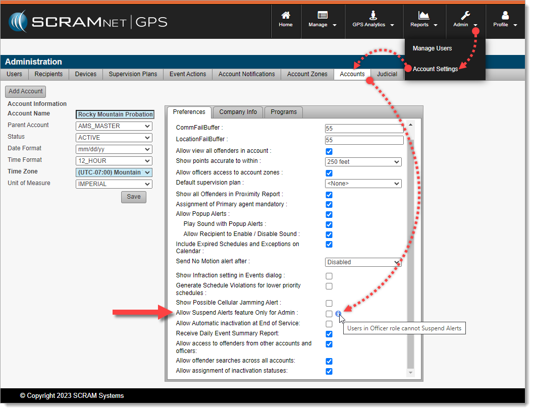 SCRAMNET GPS Administrators may limit who can suspend alerts for a client to Administrator users only. This will prevent users with Officer permissions from suspending alerts for clients; only users with Administrator permissions will be able to suspend alerts.