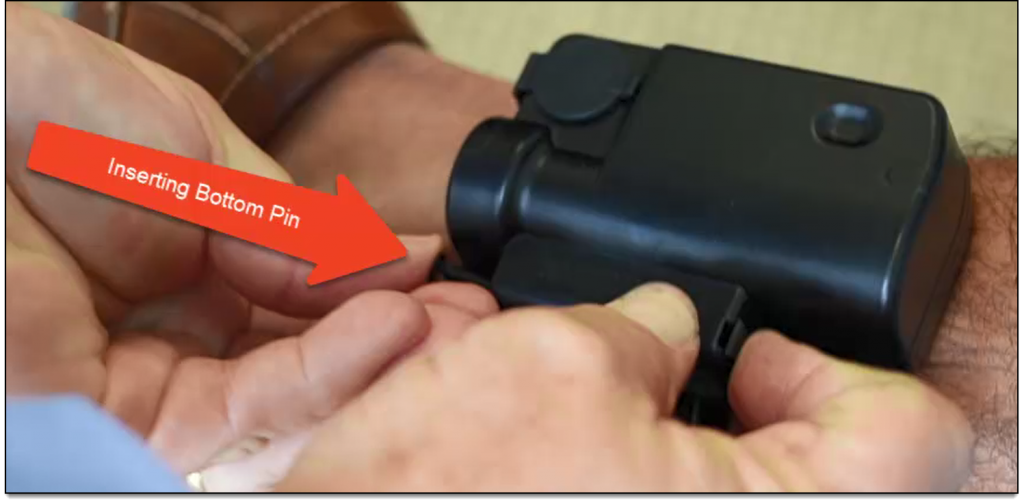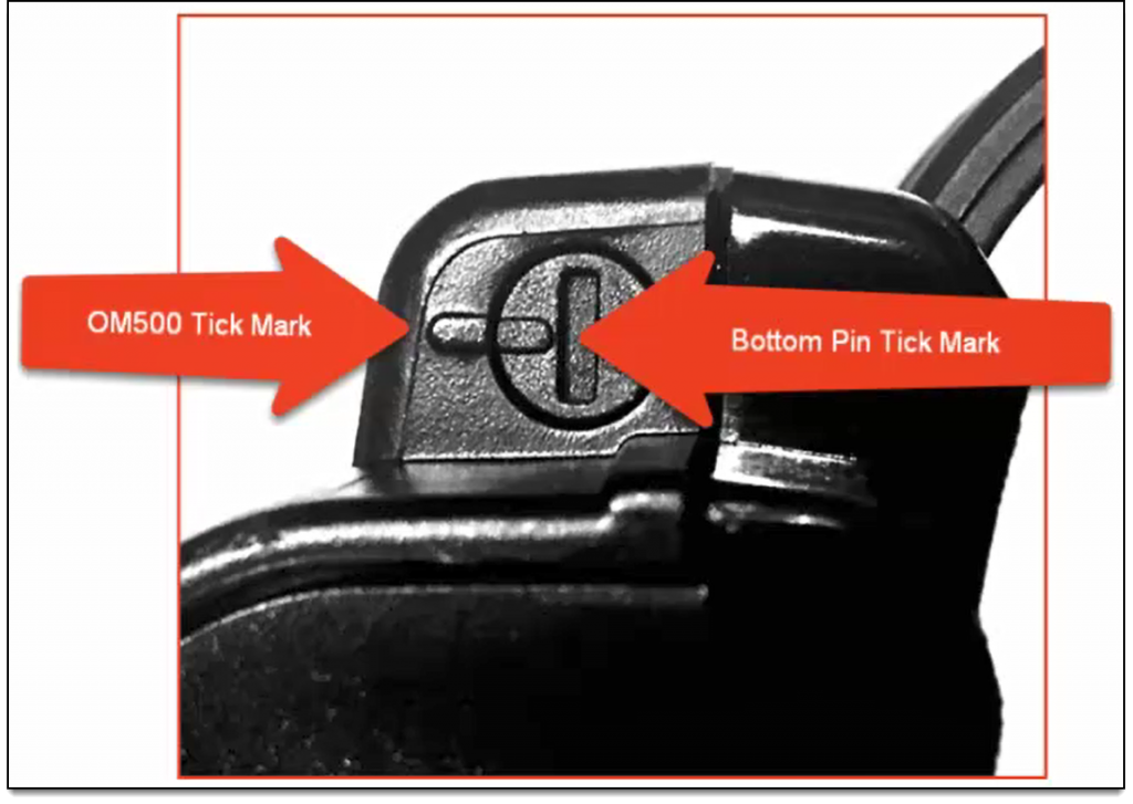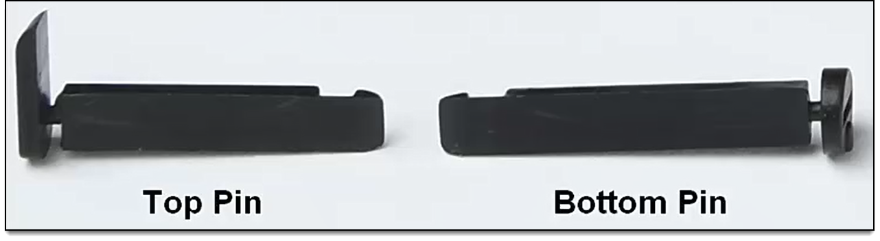 Note: The bottom pin MUST be inserted with the teeth on the pin facing the device and the tick mark on the pin MUST align with the tick mark on the device.