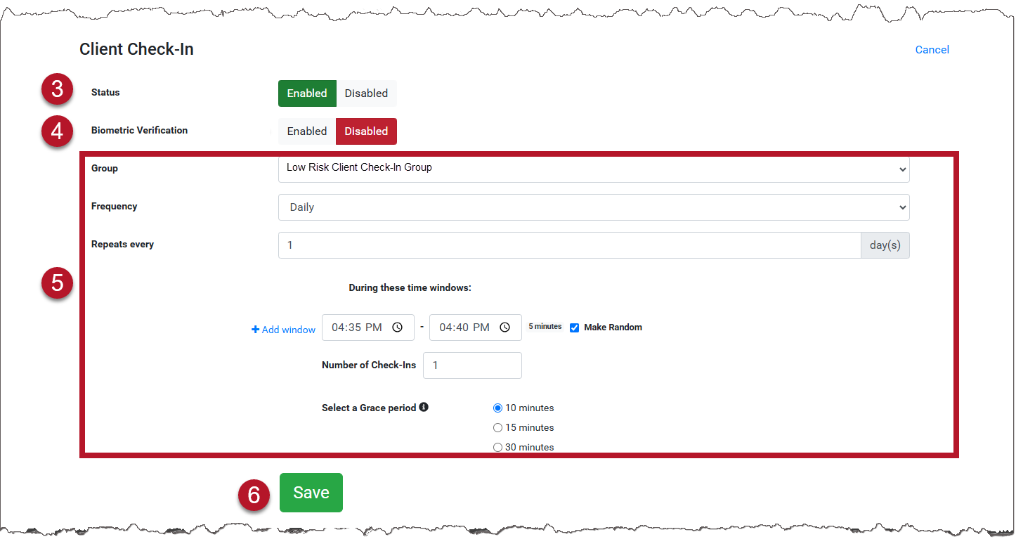 - To add multiple check-ins during a check-in window, select the Make Random checkbox. You will then set the number of check-ins the client must complete during the window and the Grace Period the client has to complete each check-in when prompted. There is a maximum number of random check-ins allowed during each window. This calculation is based on 30-minute intervals plus the grace period. An error message will display if you try to enter more check-ins than allowed during a window.