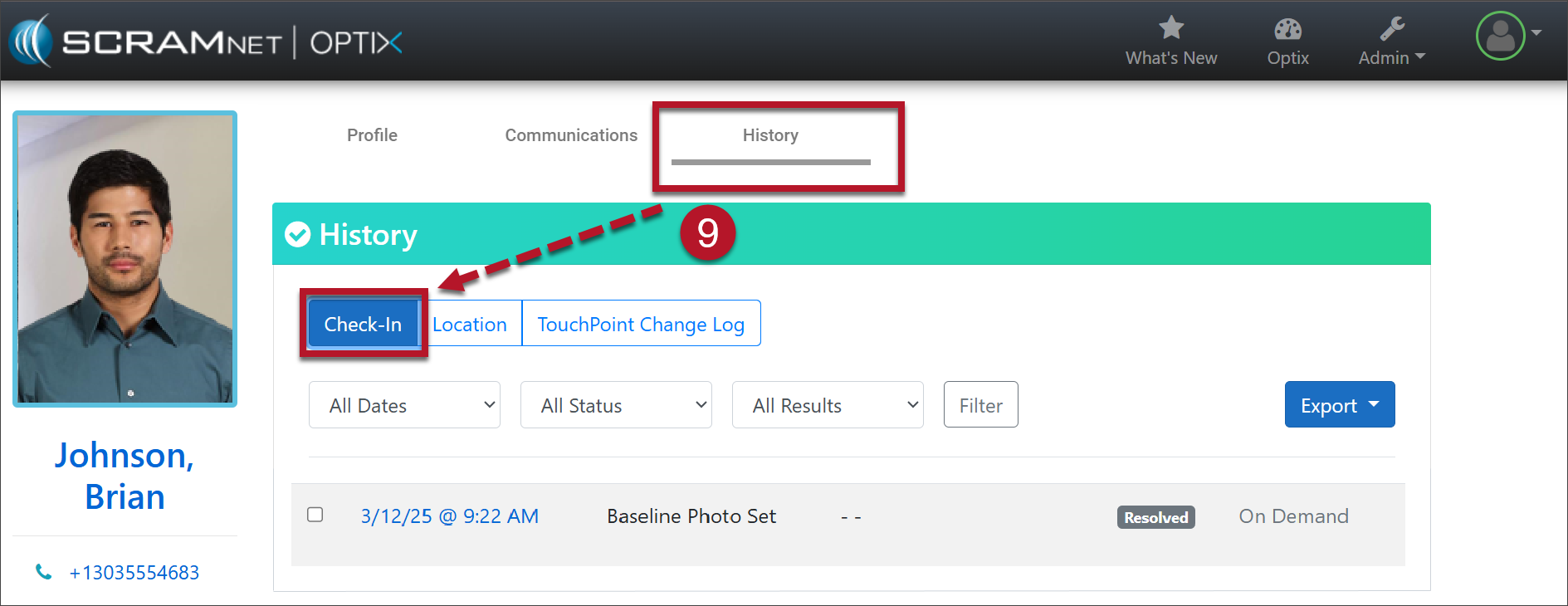 - From the History tab at the top of the client’s Profile page, select the Check-In tab to see updates.