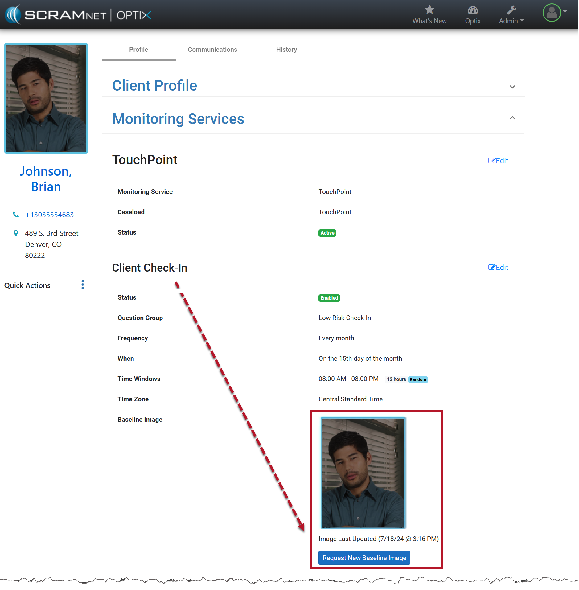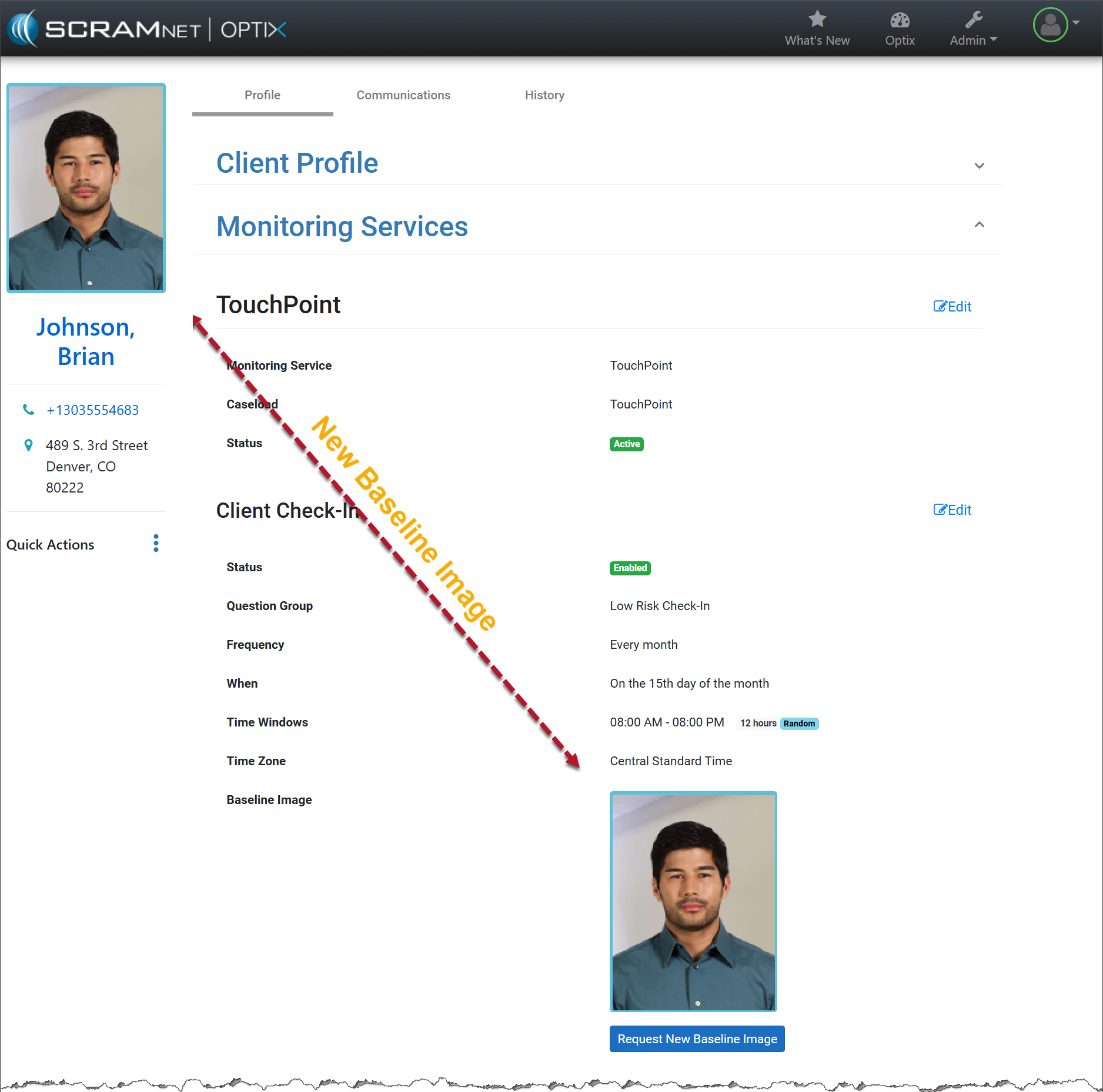 Each time a Client Check-in is completed, the photos taken create a gallery of images. TouchPoint uses these images to “learn” and ensure higher accuracy of facial recognition. If the initial baseline image is poor in quality or does not display the client’s entire face, it may be necessary to request a new baseline image for the client. When a new baseline image is requested, you reset the baseline image and gallery for the client. TouchPoint will restart the learning process and build a new gallery of images.