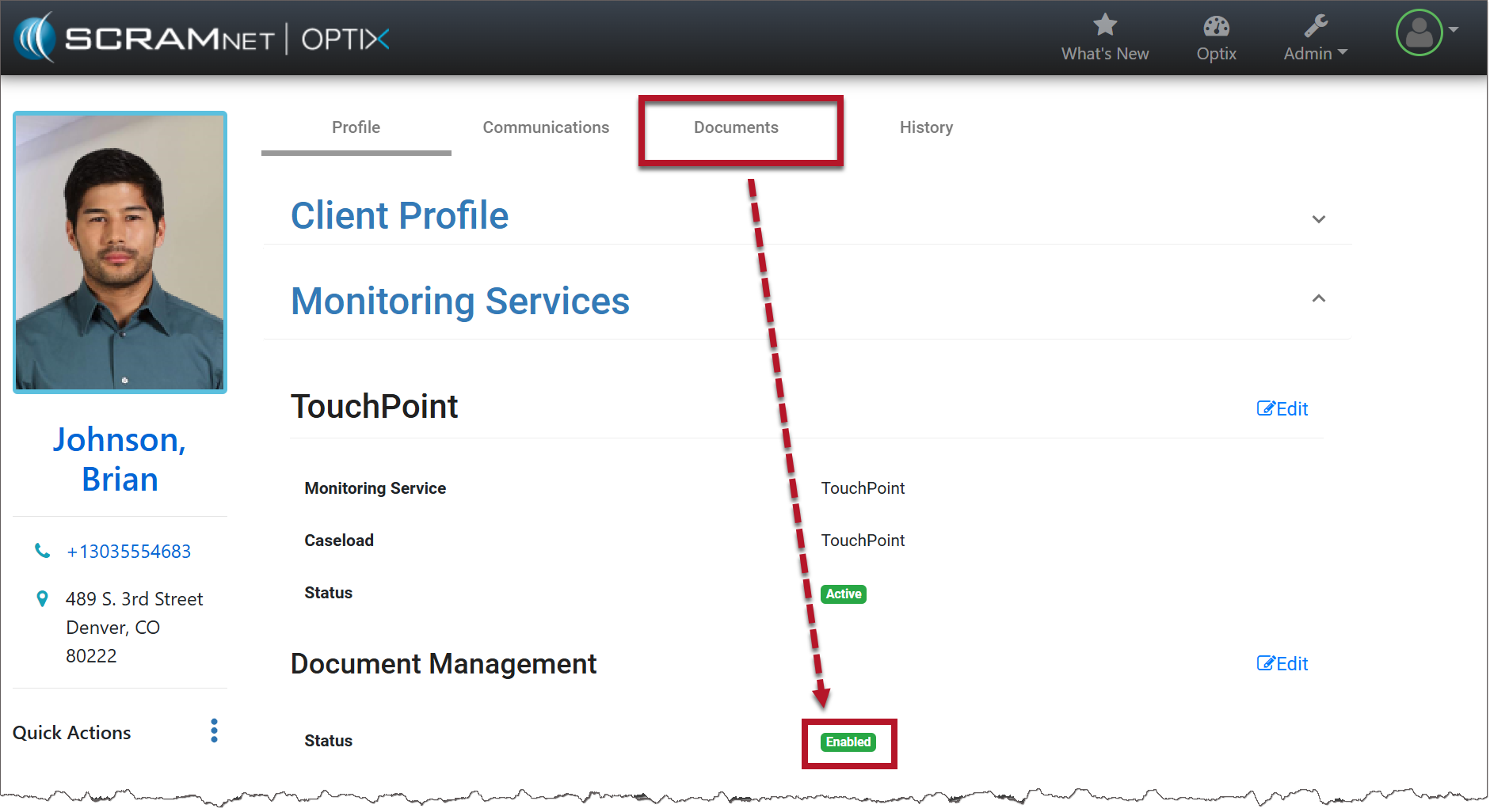 A Documents tab is now displayed at the top of the client’s Profile page.