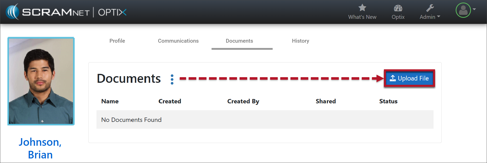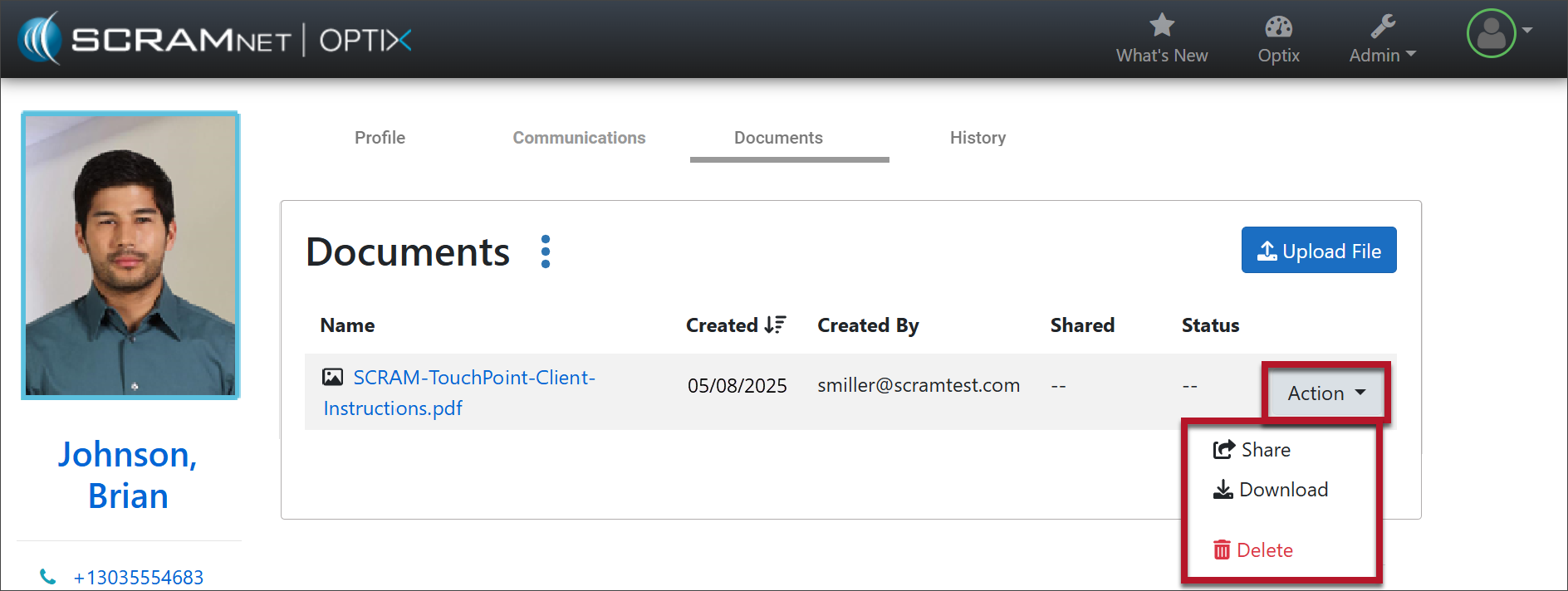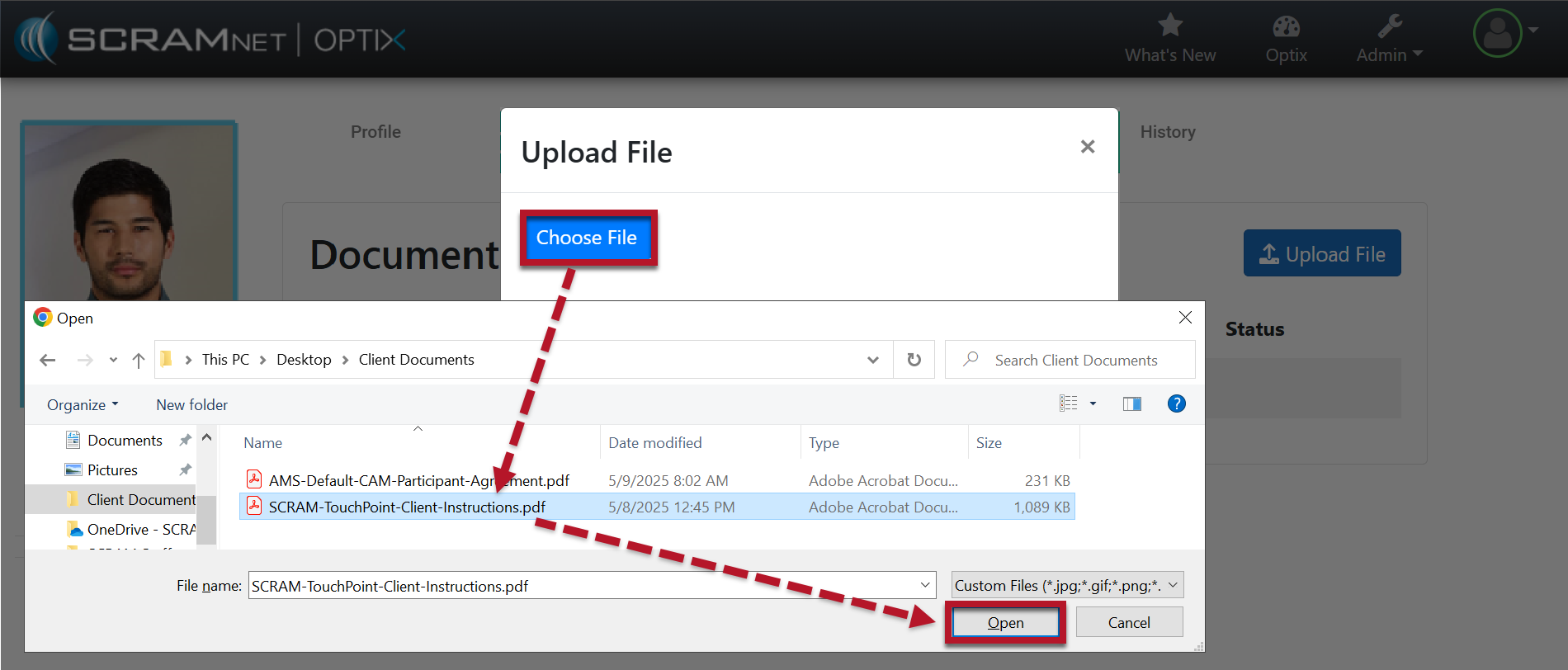 During your client’s TouchPoint monitoring program, you may wish to save documents related to the client’s profile in SCRAM Optix. These documents may include court-specific files, time cards, or other important documents. In addition to saving documents, you may share files with the client, require client eSignatures, receive files from the client via the TouchPoint app, and then download shared files received from the TouchPoint app to your computer. In short, the Documents feature offers a centralized location for client file storage and facilitates easy management.