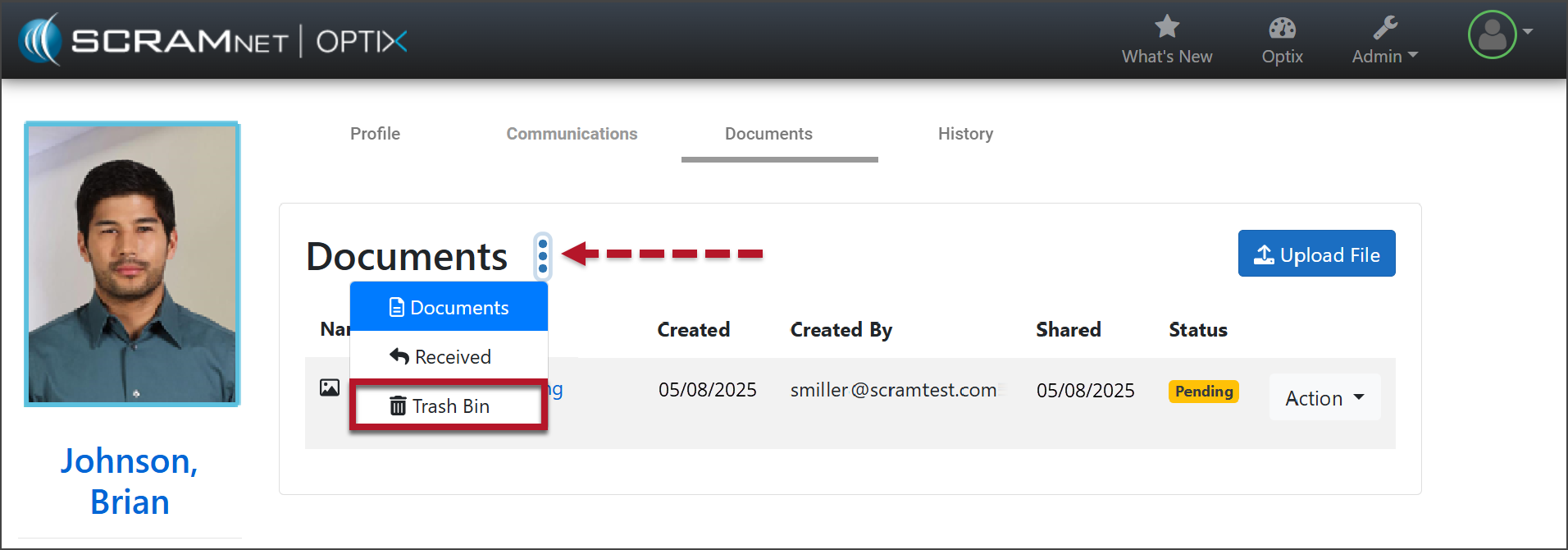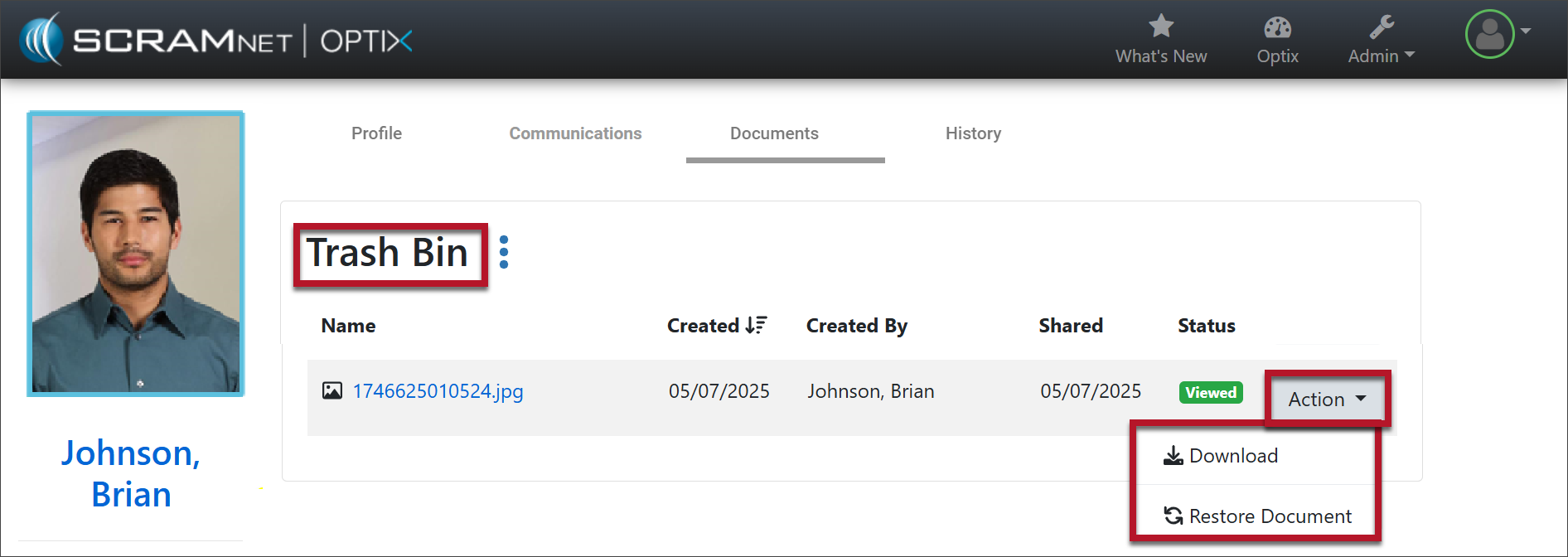 Once a file has been deleted from the Documents page, you may view it, download it, or restore it from the Trash Bin if necessary. To do this: