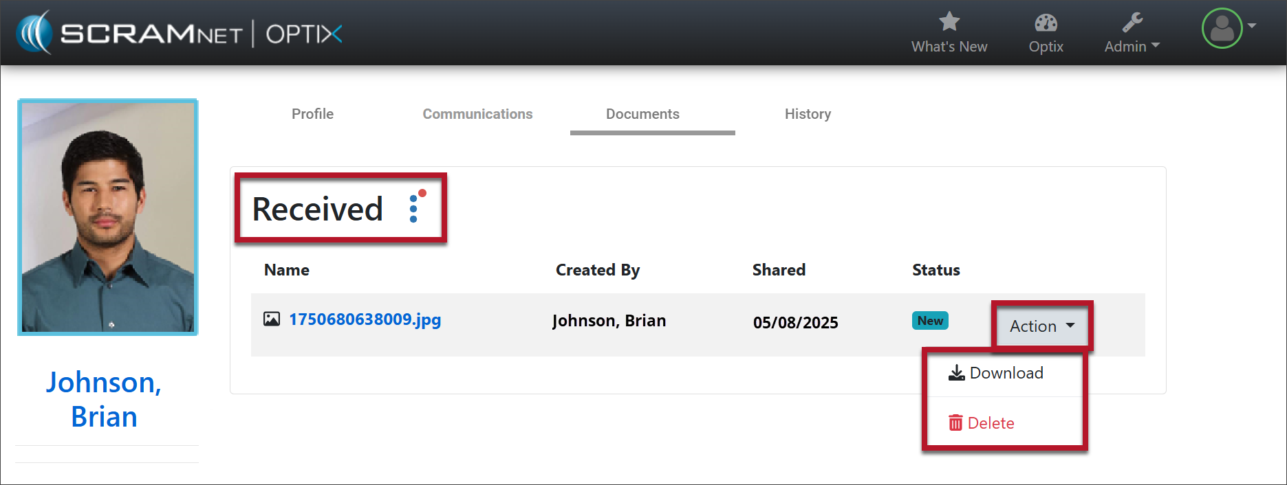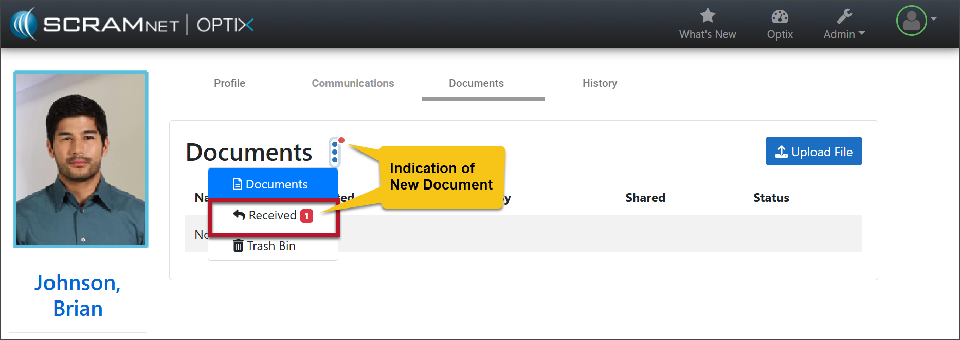 When a client uploads and shares a file or document from their SCRAM TouchPoint app, a red alert badge is displayed on the Received button on the Documents page.