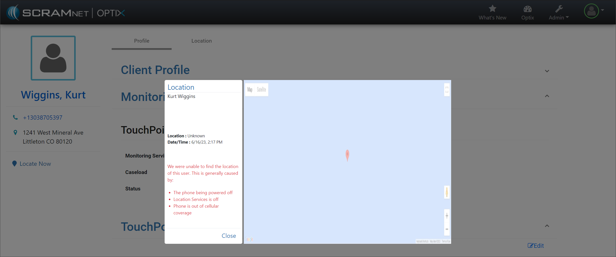 The system will request the location information from the client’s smartphone for five (5) minutes. If no information is available after five minutes, the Location pop-up will list the location information as “Unknown” along with possible causes.