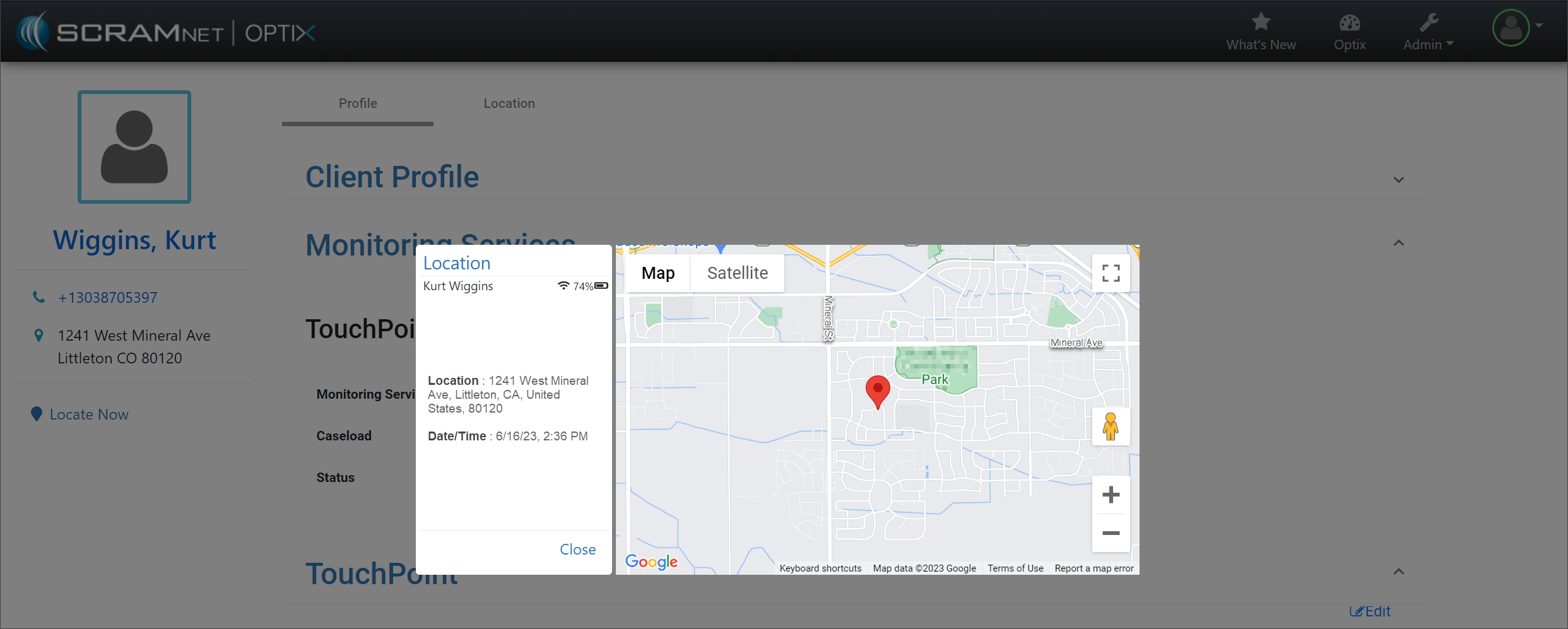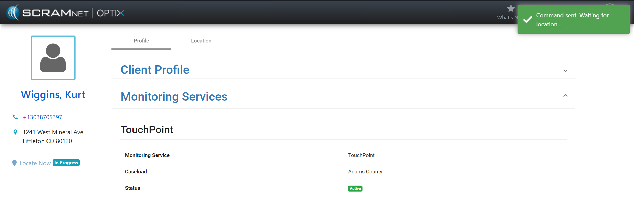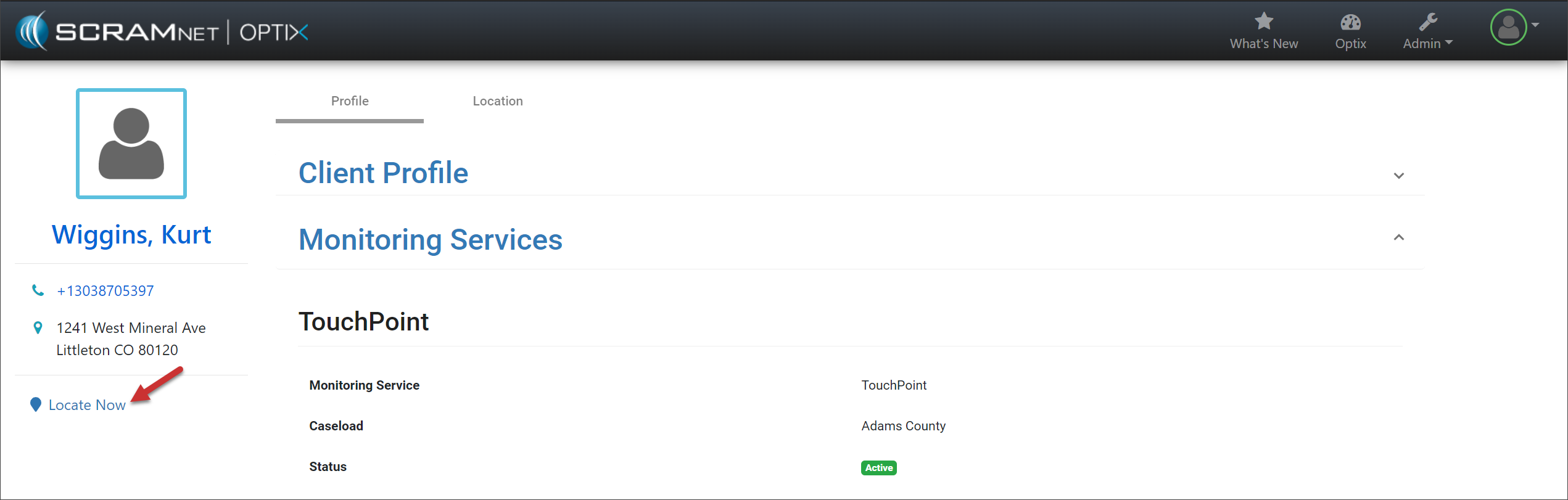 Access your client’s TouchPoint Profile and select the Locate Now hyperlink on the left-hand side of the page.