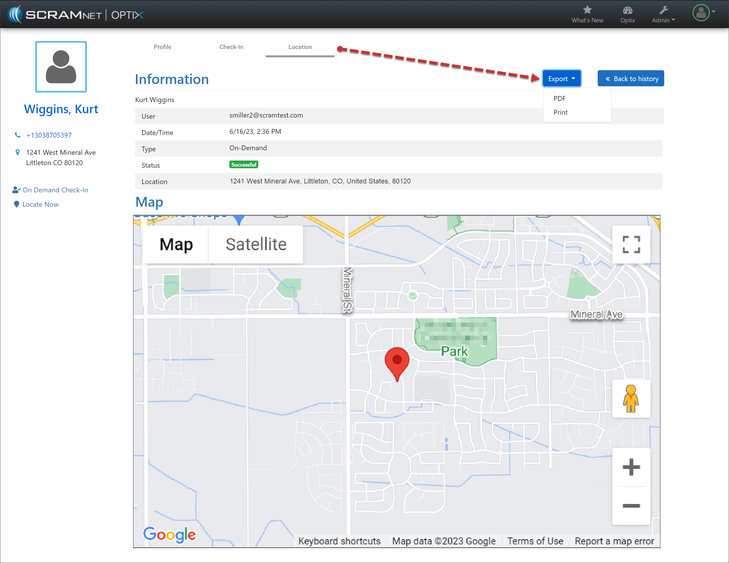 Select a specific result’s date and time hyperlink to view the associate location information, and print or export a .pdf of the details if you wish.