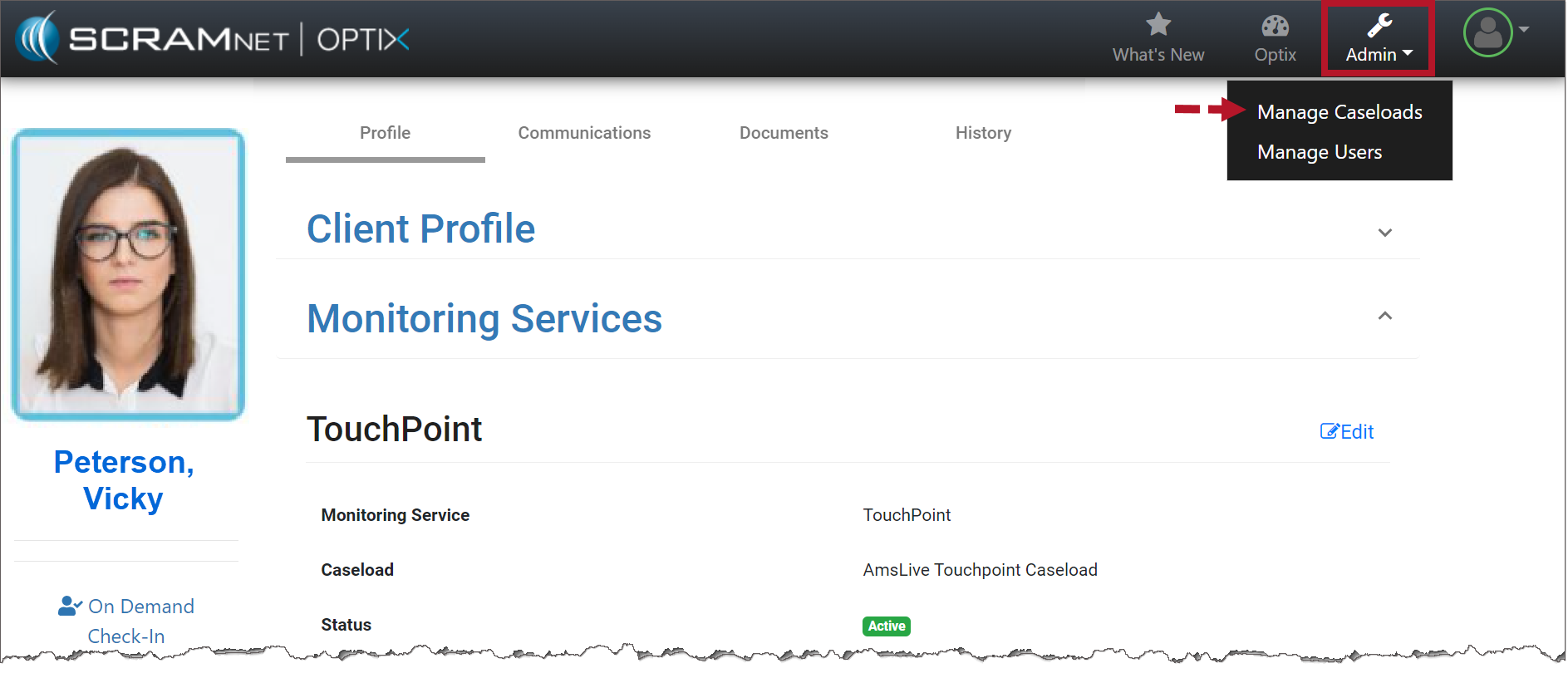 Navigate to an Optix Client Profile page, select the Admin icon and then the Manage Caseloads option from the menu.