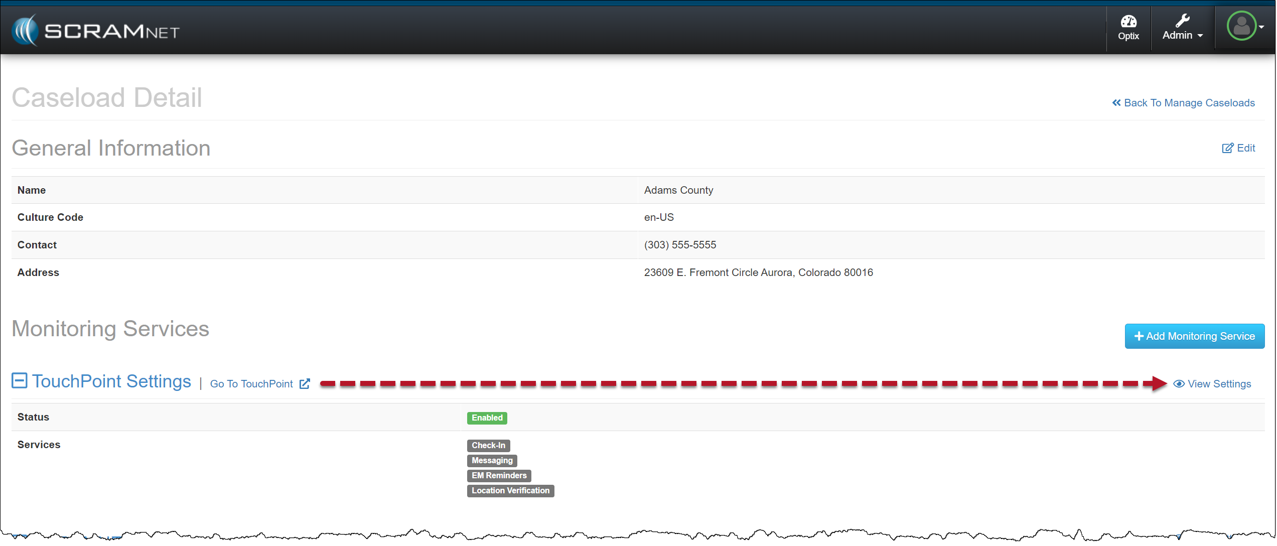 - On the Caseload Detail page, locate the “TouchPoint Settings” under the Monitoring Services section and select the View Settings hyperlink.