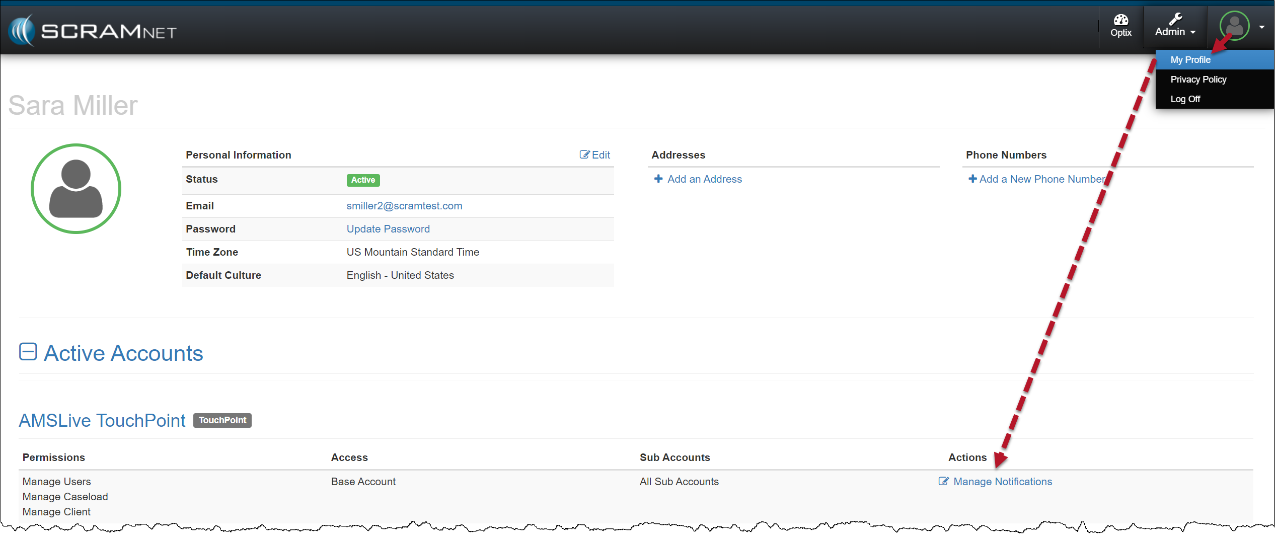 - Locate and select the Manage Notifications hyperlink for the TouchPoint Caseload.