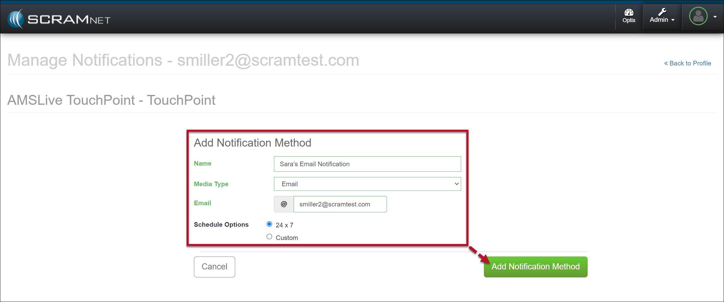 - Enter the details for the notification method. In the Schedule Options section, select the Custom option to customize the timeframe for which you wish to receive electronic notification, or leave it at the default of 24×7.