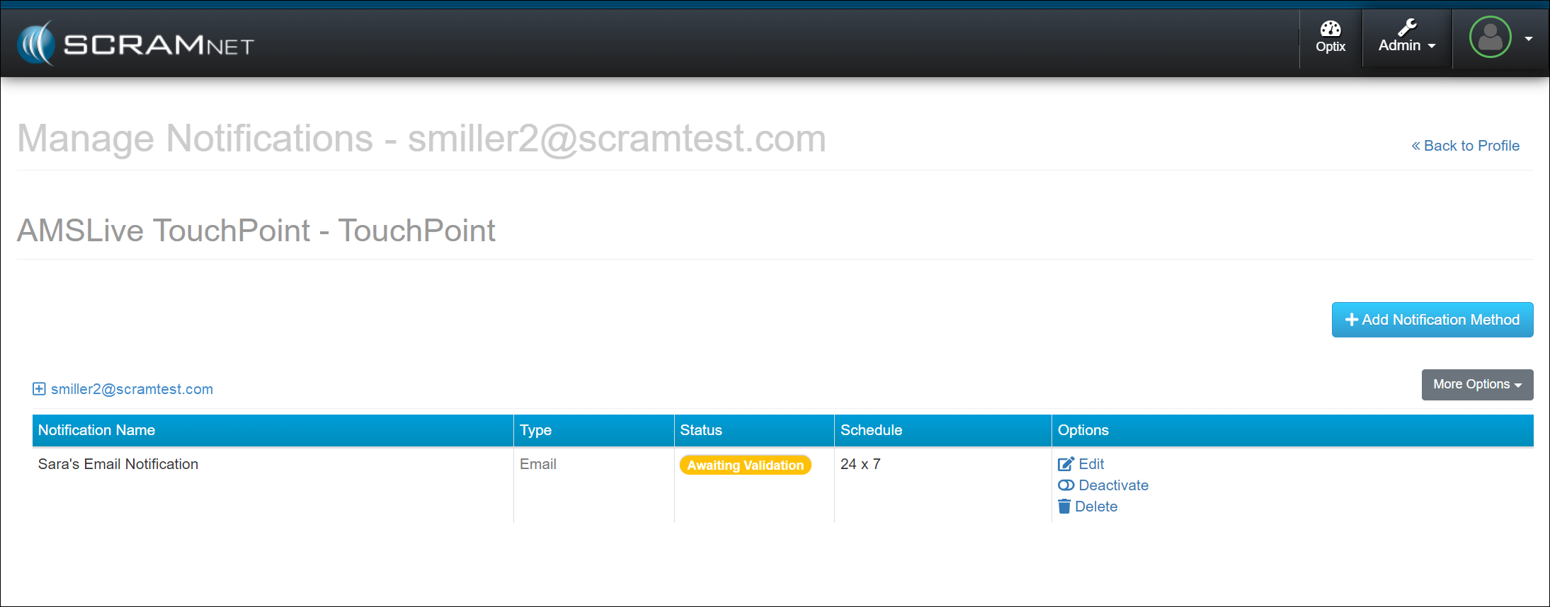 Once saved, the user’s Manage Notifications page will display the notification method as “Awaiting Validation,” and a validation email or text message will be sent using the notification method entered.
