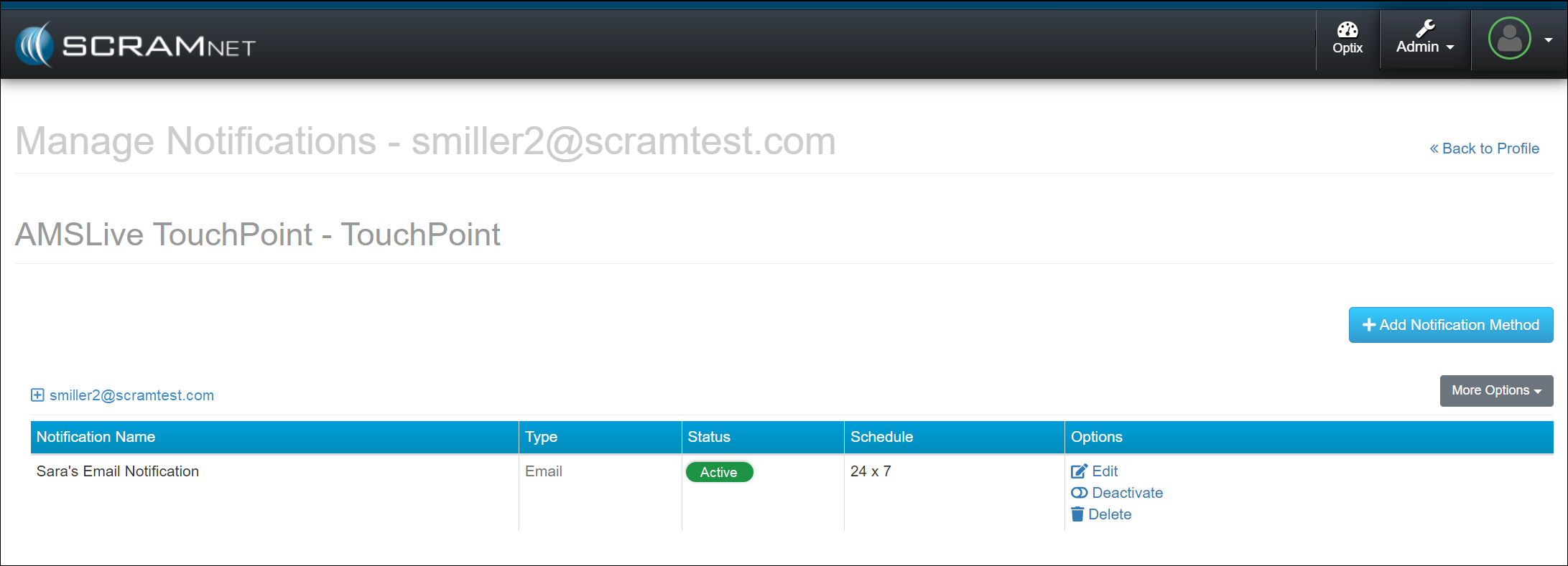 In the Options column, use the hyperlinks to edit, deactivate, or delete the notification method. Additionally, you may select the “More Options” button and edit the notification method, or send a test email or text message.