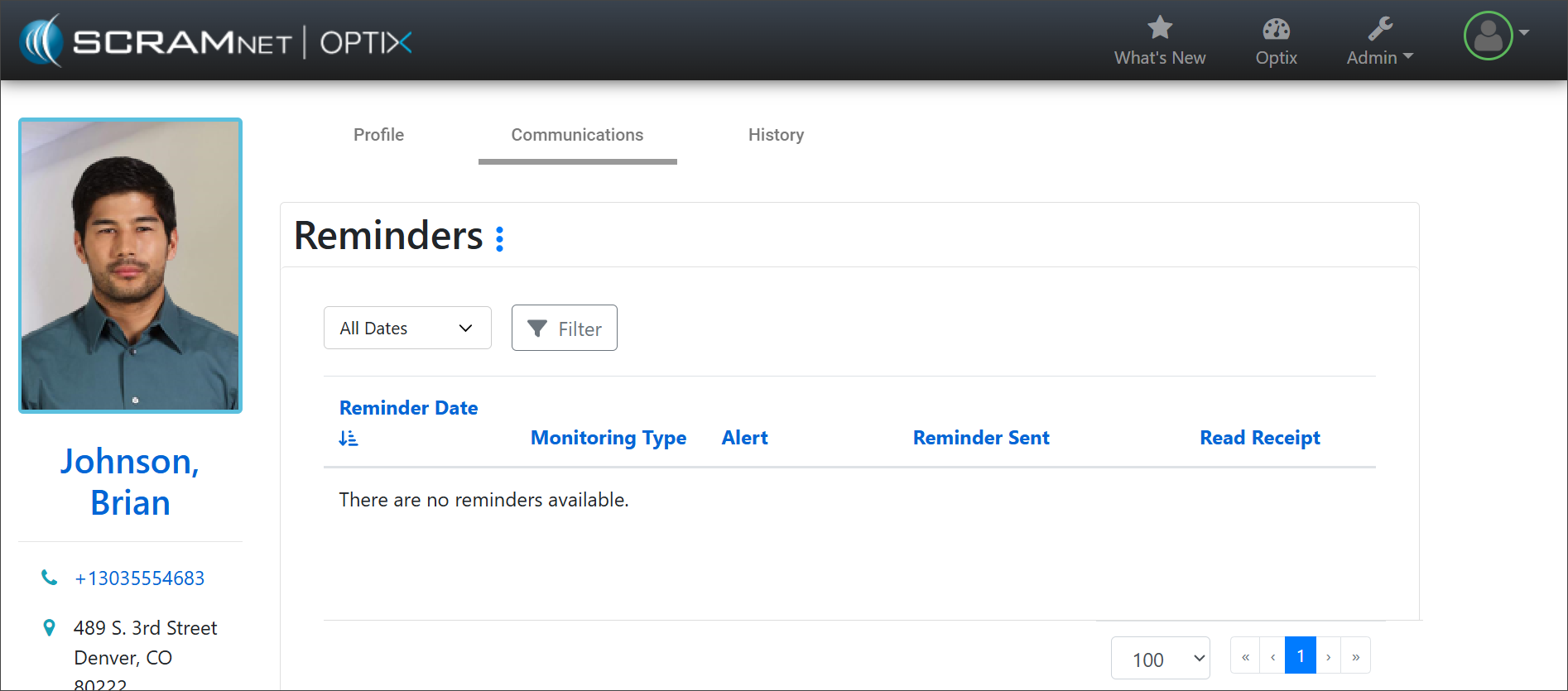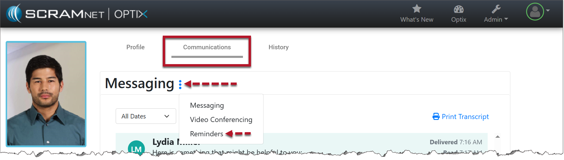 - Once the window has been refreshed, select the Communications tab. Open the Messaging ellipsis menu and choose Reminders to view the history of all EM Reminders that have been sent.