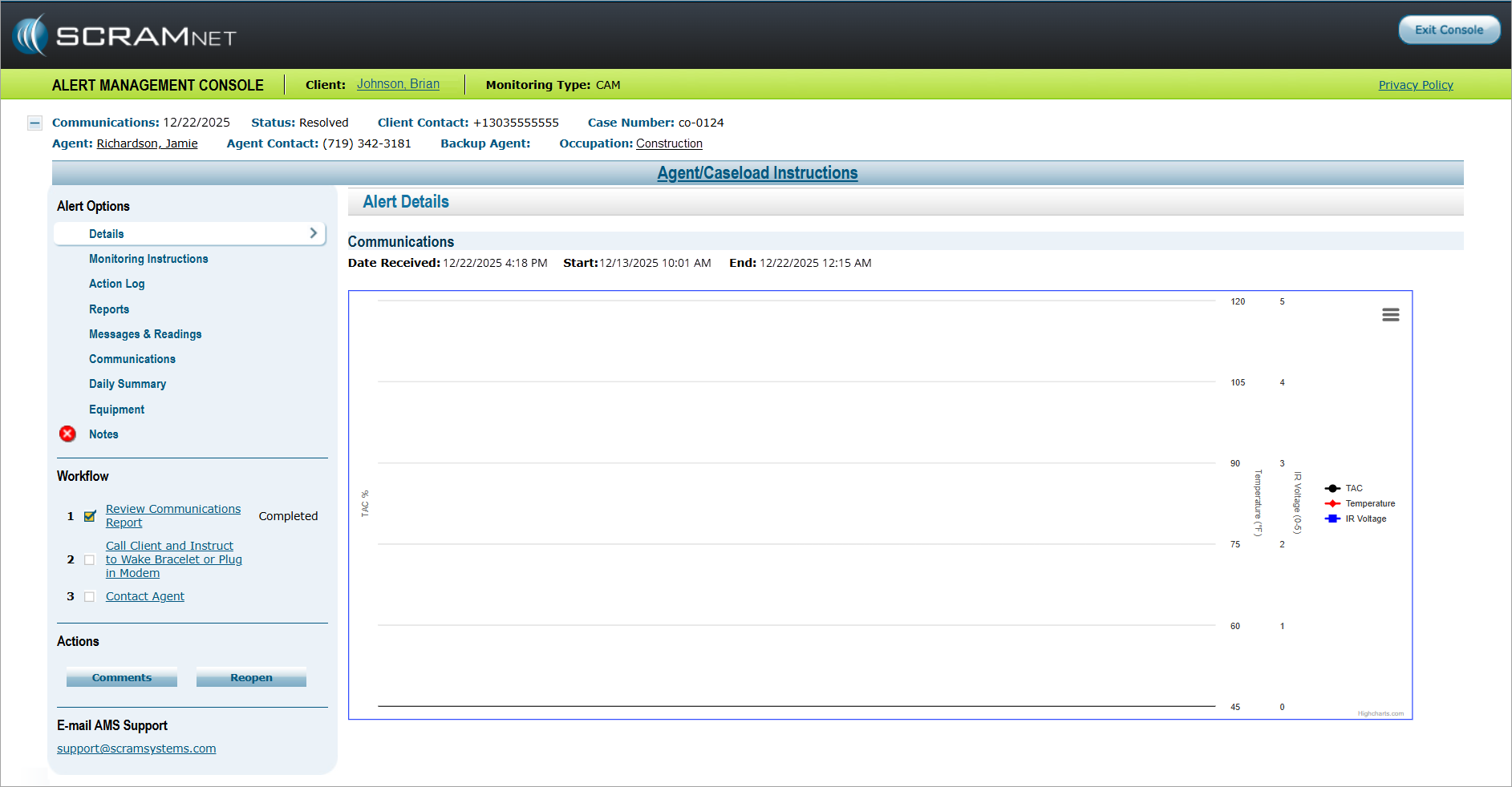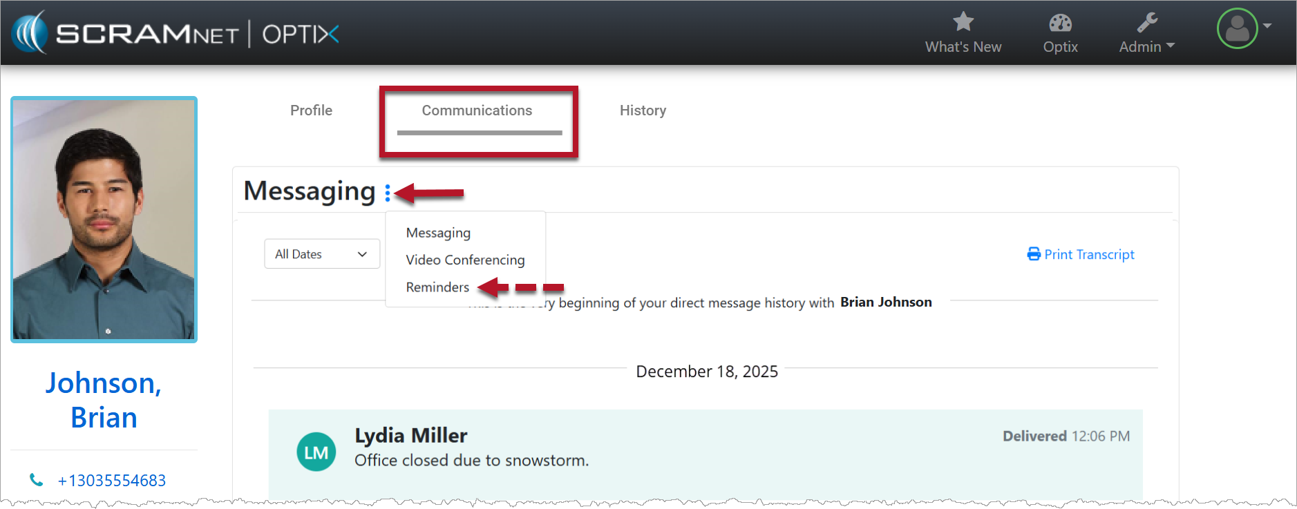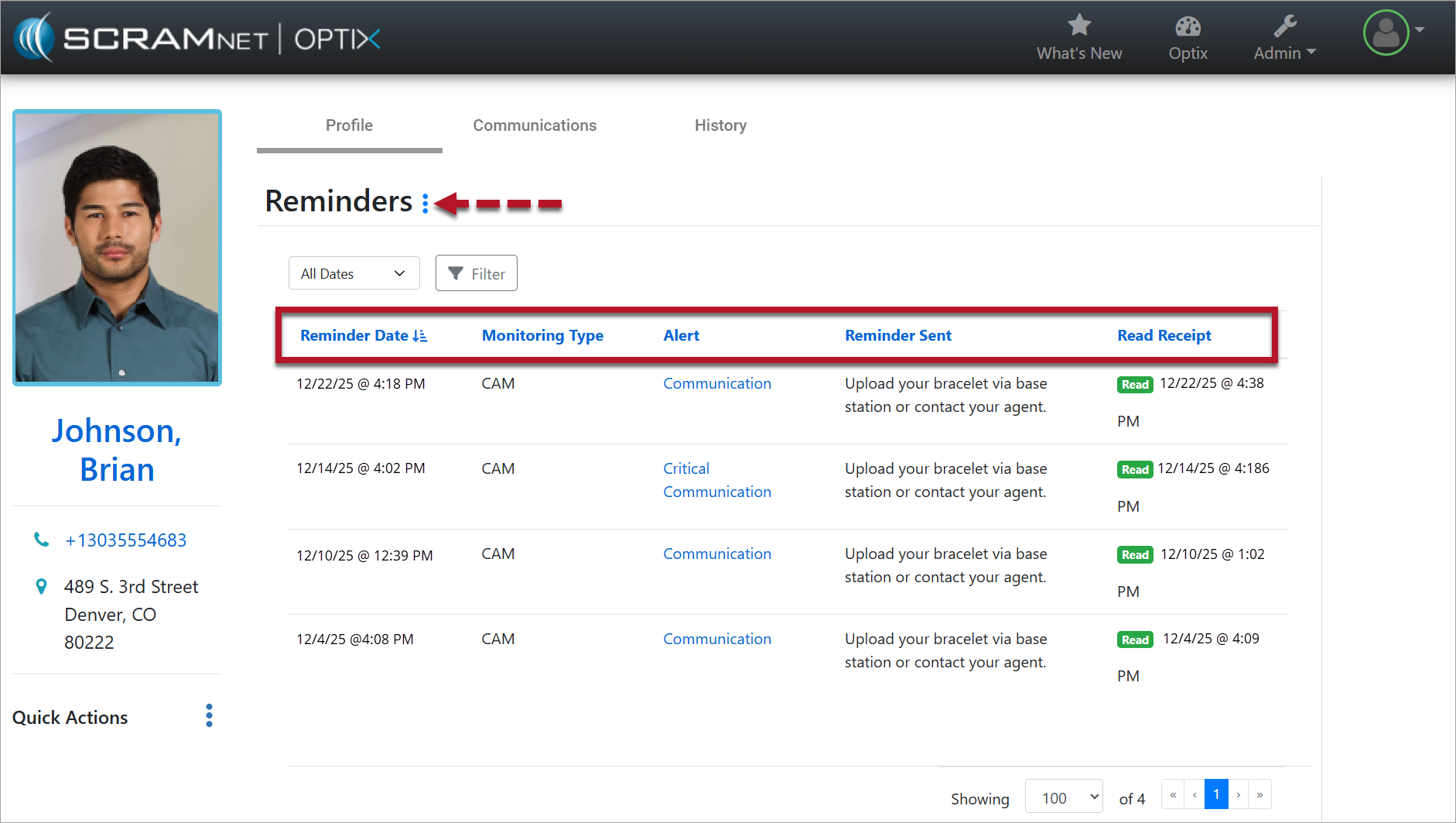 EM reminders originate in either SCRAMNET or SCRAMNET GPS. You manage the events that trigger the reminder in the appropriate system. View the reminders sent to your client and whether the client has viewed the reminders in the TouchPoint app by navigating to the client’s Reminders tab in Optix.