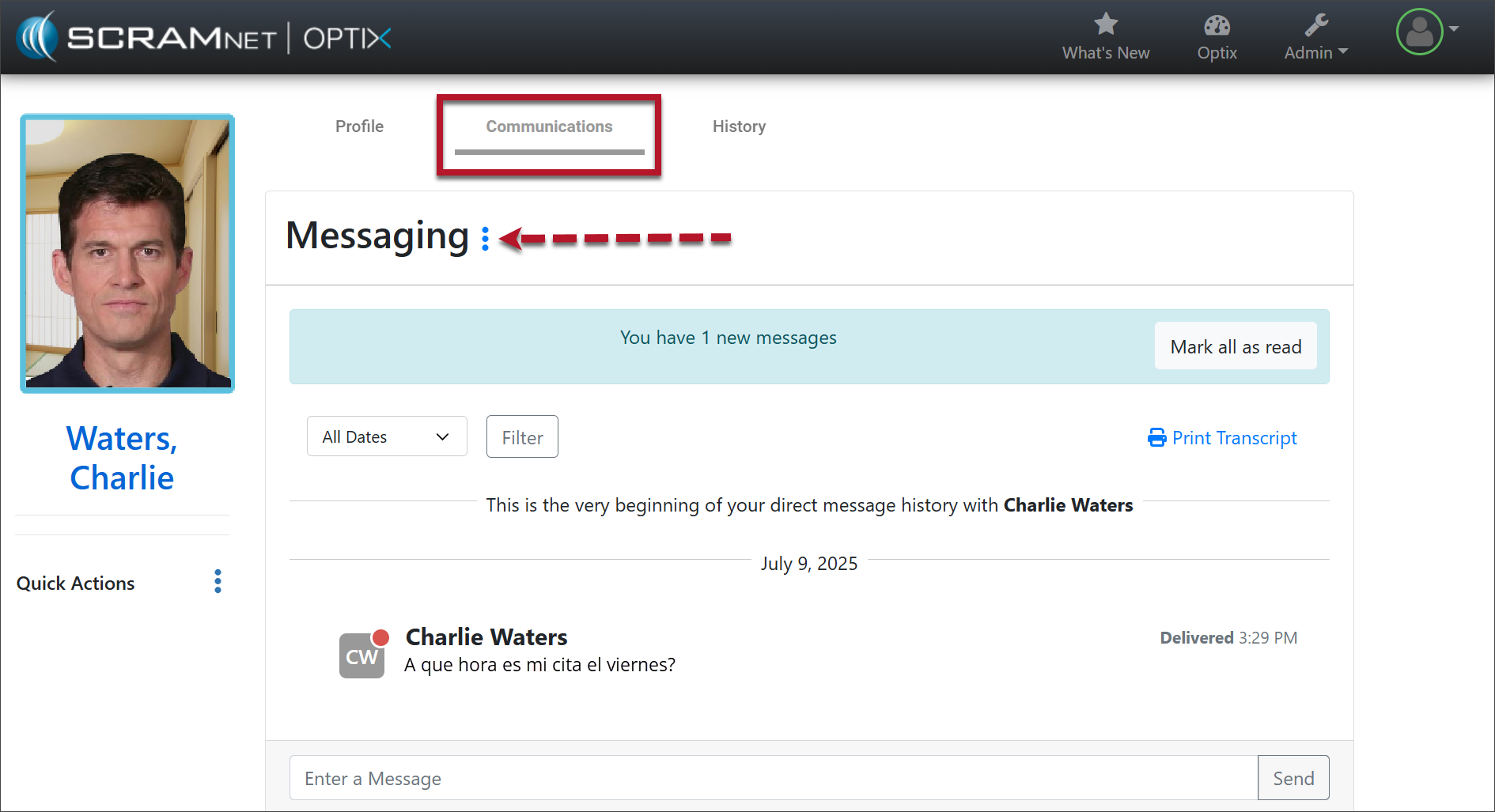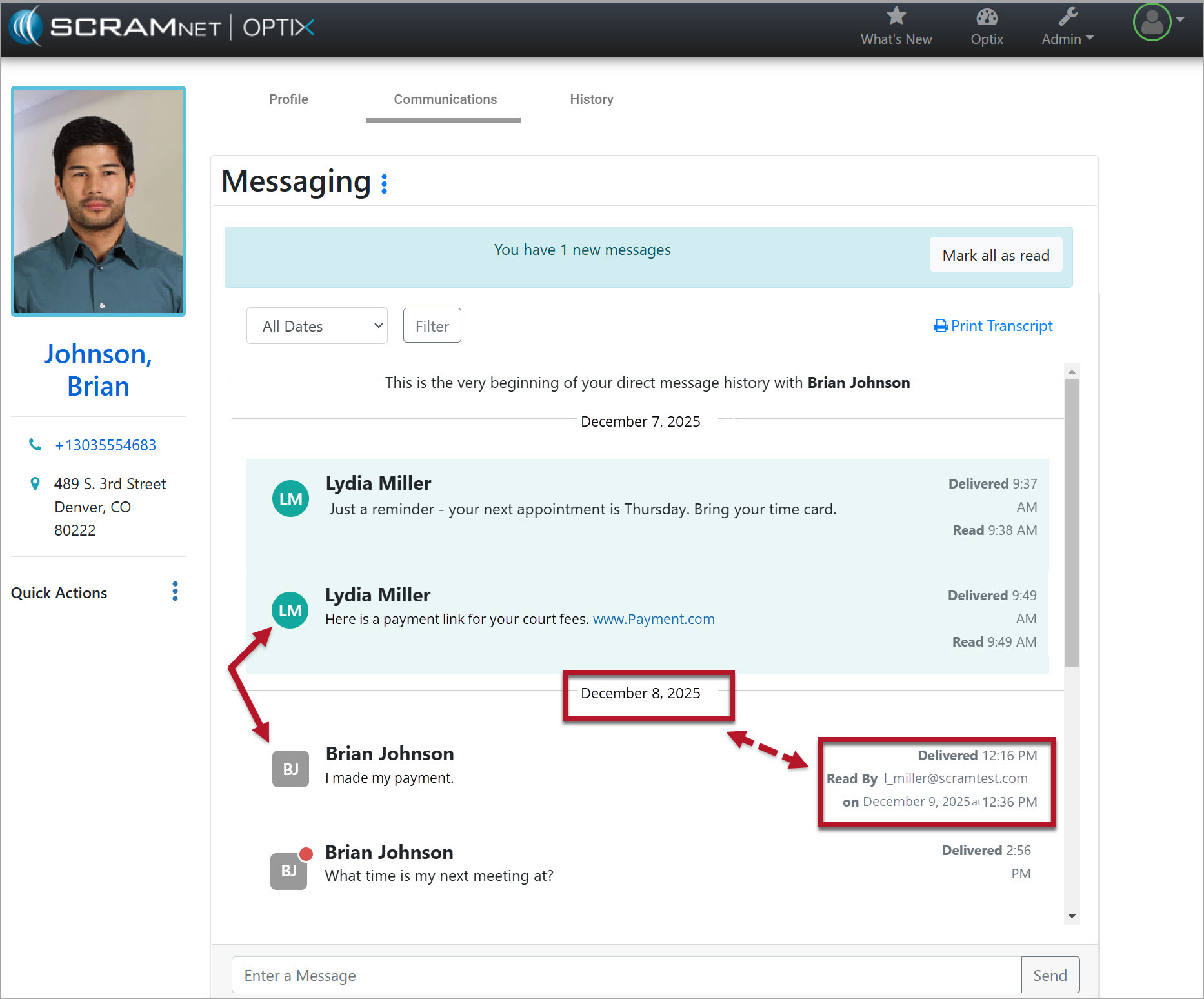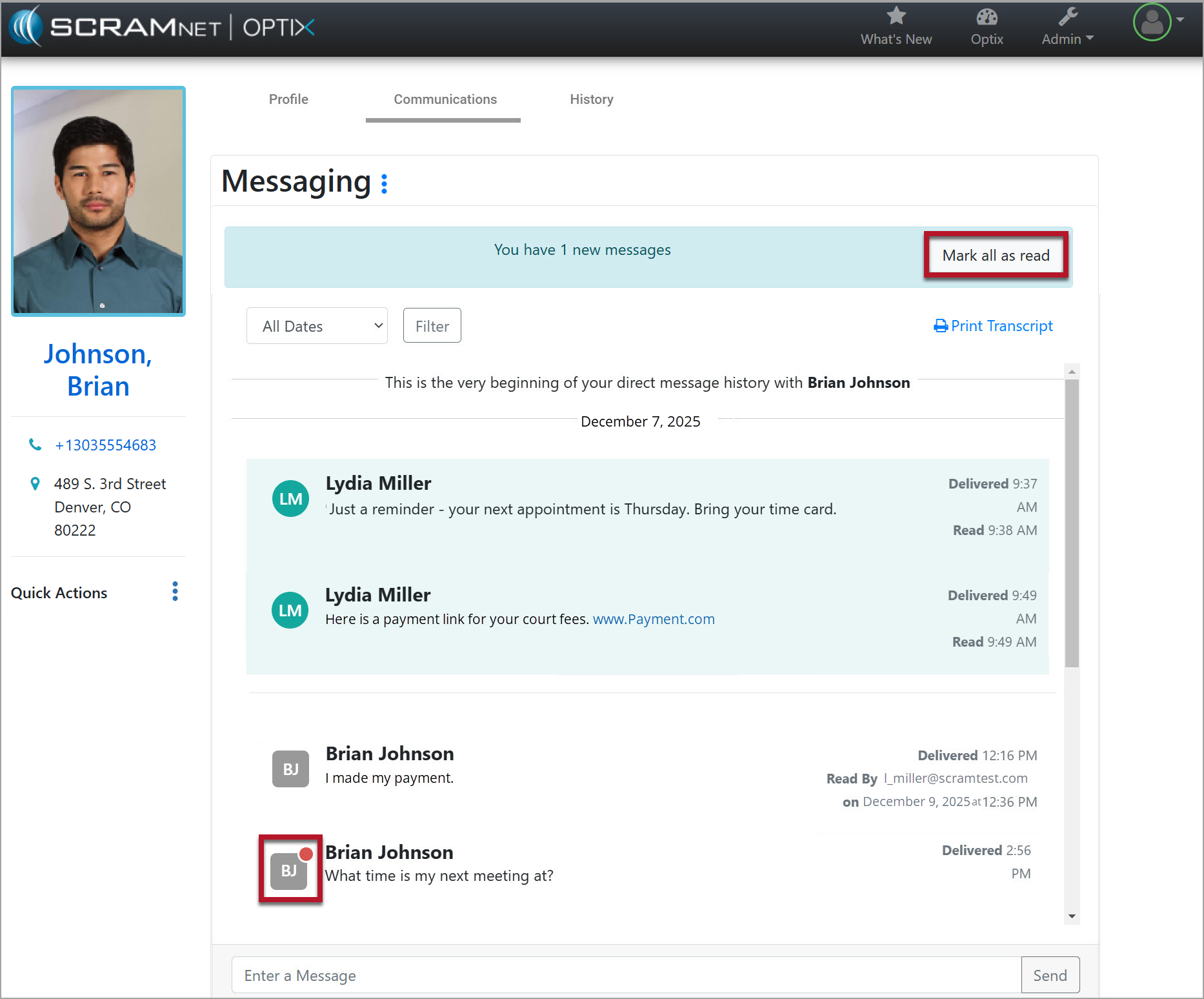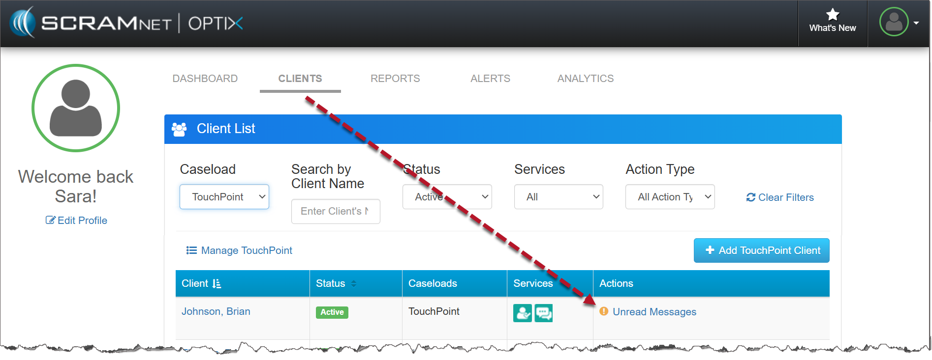 Next, select the Unread Messages link under the Actions column to see the details on the client’s Messaging page.