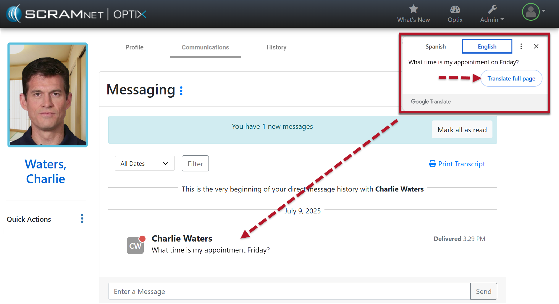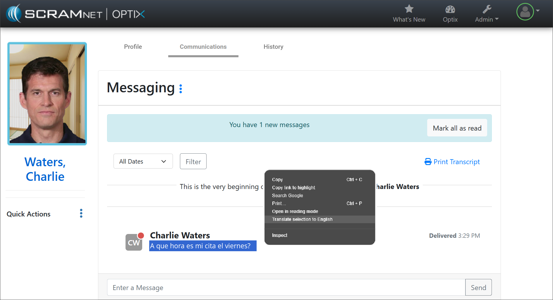 Use your browser’s “Translate” feature (or Google Translate) to read messages from clients written in languages other than English in SCRAM Optix. When using Google Chrome, highlight the text, then right-click and select the “Translate” option from the menu that appears.