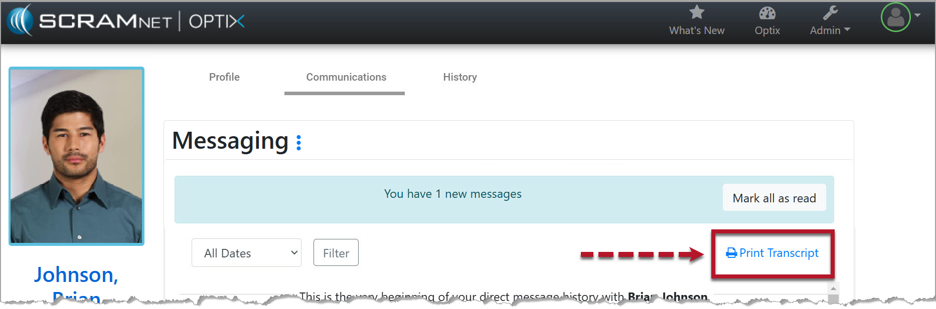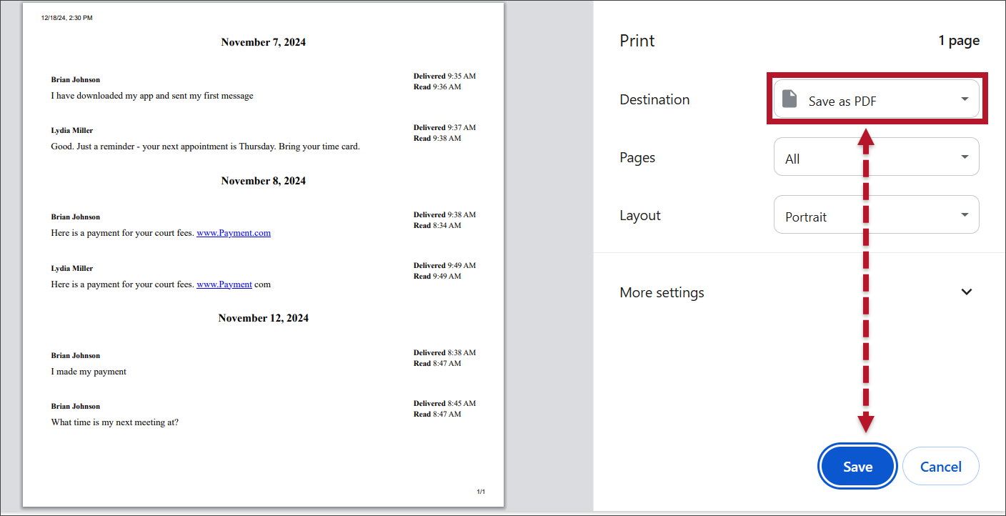 Select the Print Transcript link to create a PDF of the entire message history. On the print pop-up, select the Save button.
