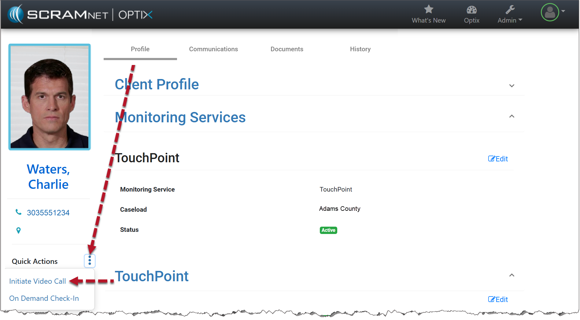 - Once enabled, an Initiate Video Call hyperlink displays in the Quick Actions dropdown menu on the side panel of the client’s Profile page, as well as on the Communications tab on the Video Conference page.