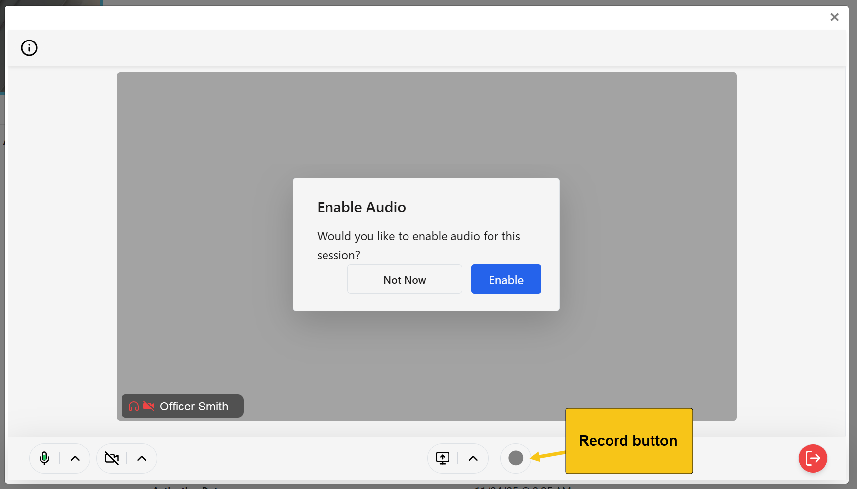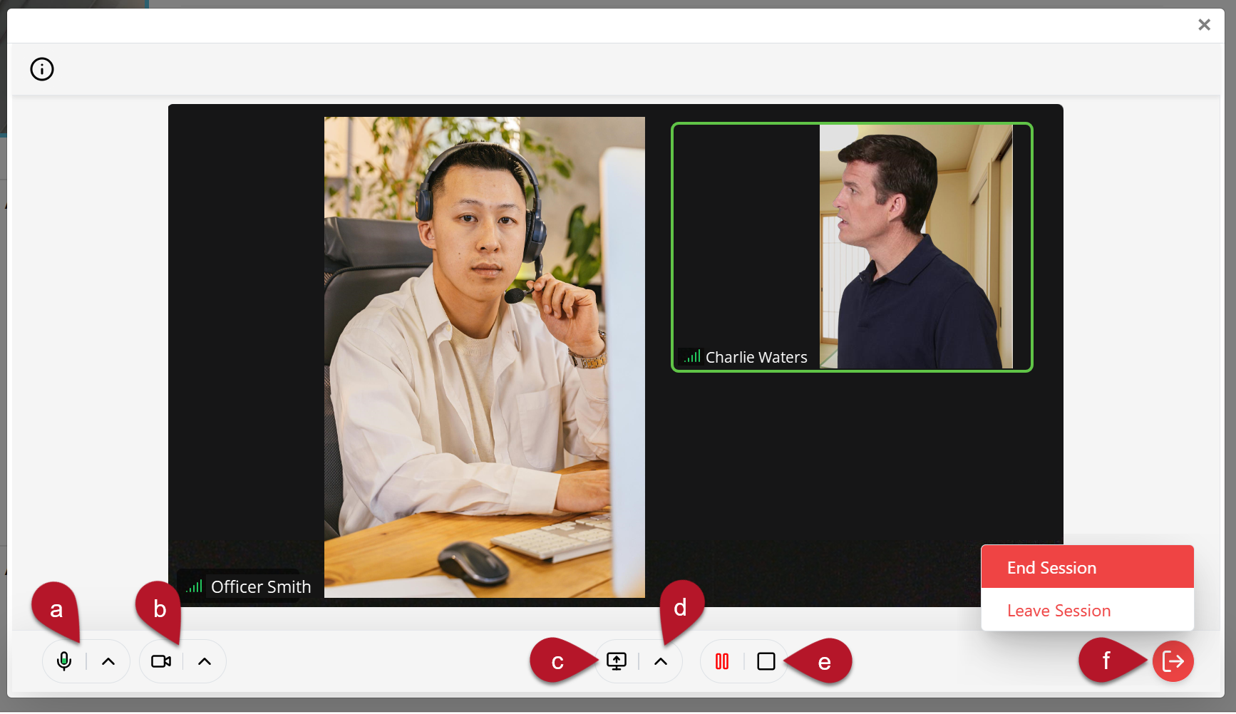- Exit Session Icon: To end or leave the session, select the red exit session icon in the bottom right corner, then choose: