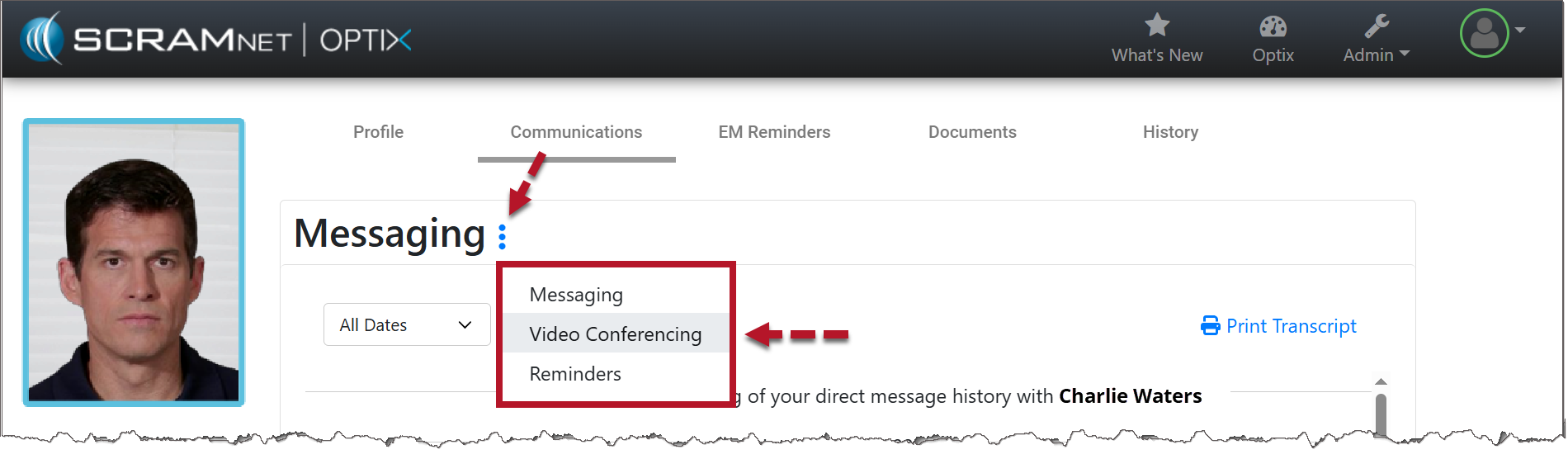 After the video call is ended, a record of the recordings and transcripts appear under the client’s Communications tab. To view all video call results, select the ‘More‘ ellipsis, and then the Video Conferencing option.