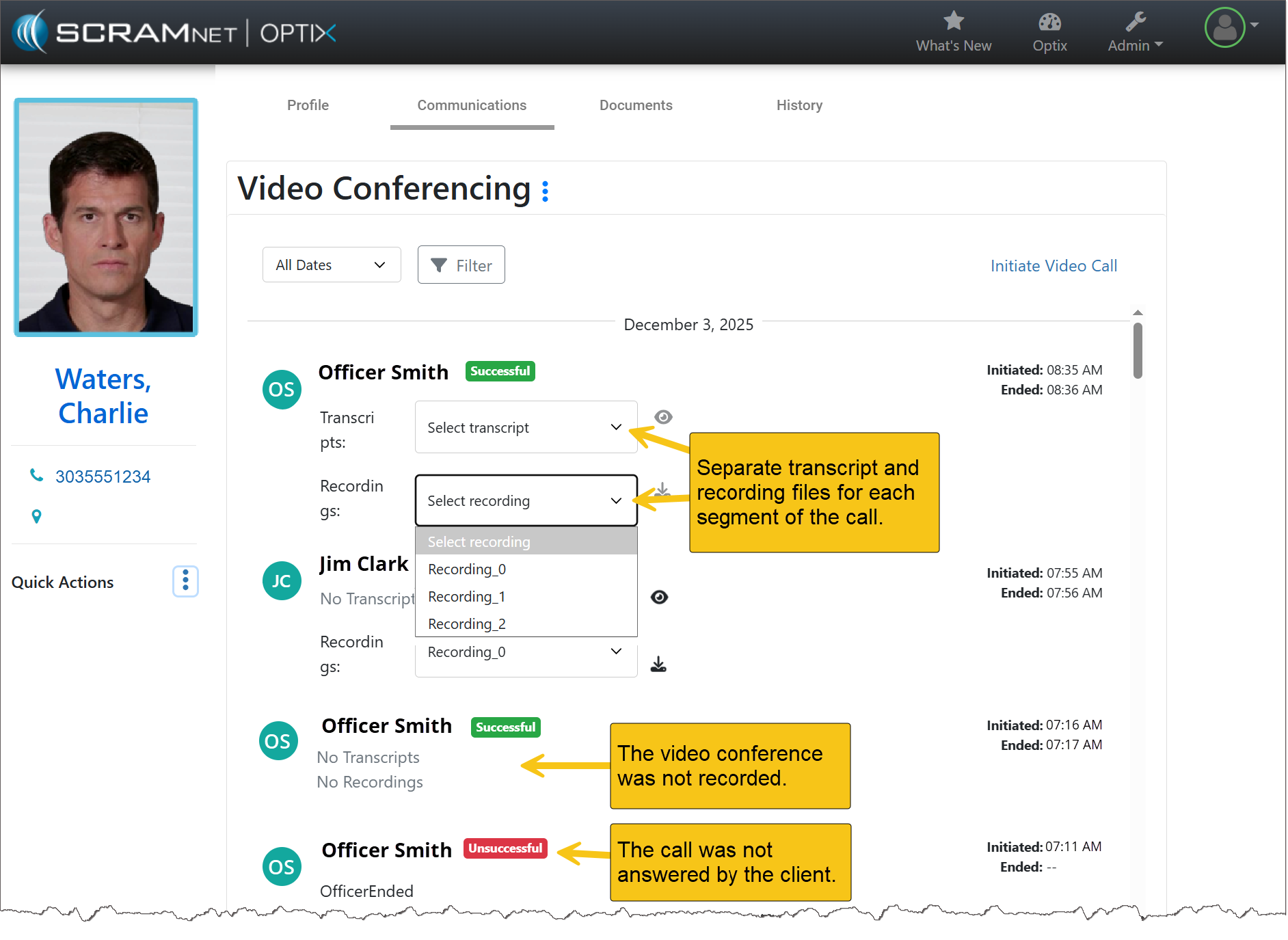 The Video Conferencing feature in Optix allows agents to place video calls directly to clients’ TouchPoint applications on their smartphones. Once a video call has been initiated by an agent, they have the option to record the session. A history of all video calls, the call results, as well as recordings and transcripts are automatically stored under the client’s Communications tab for future reference.