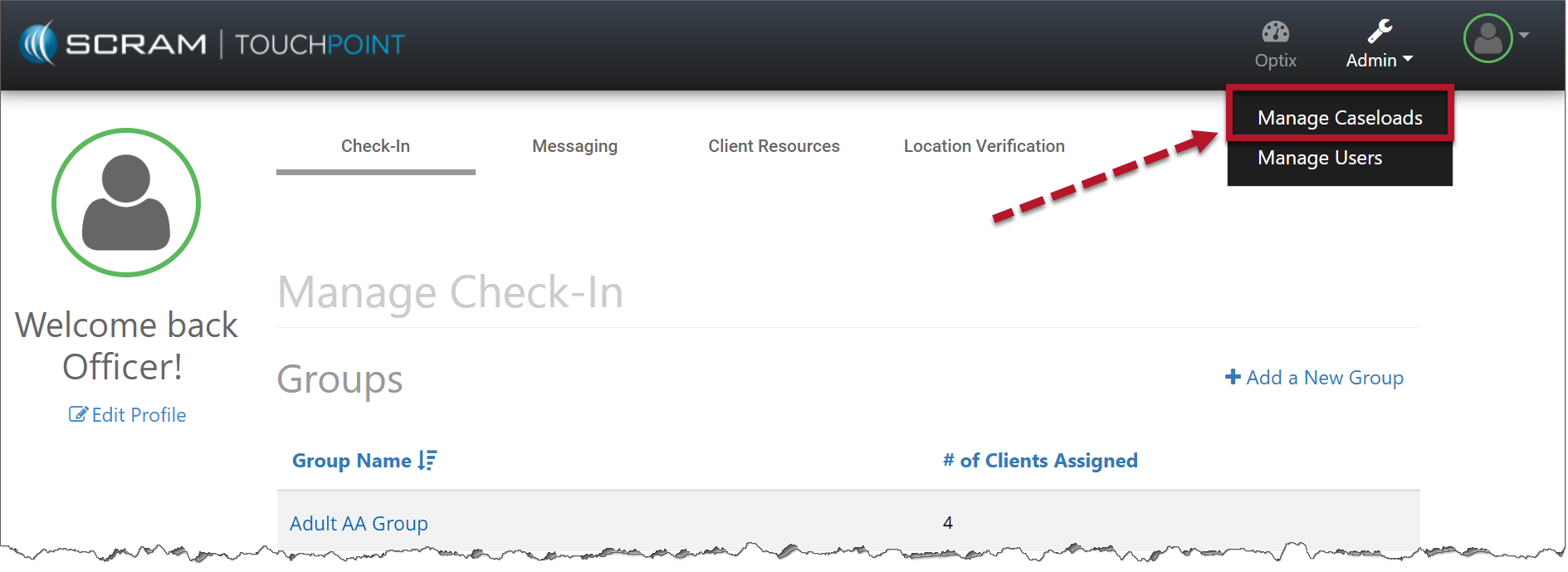 - On the Manage Check-In page, select the Admin button on the top toolbar and then select the Manage Caseloads option from the dropdown menu.