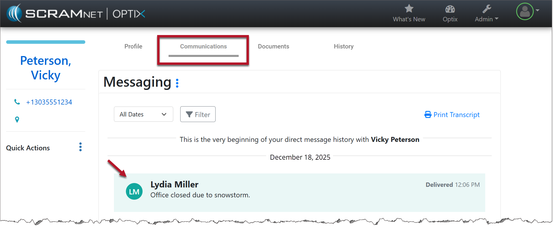 A record of the message will appear on each client’s Communication page.