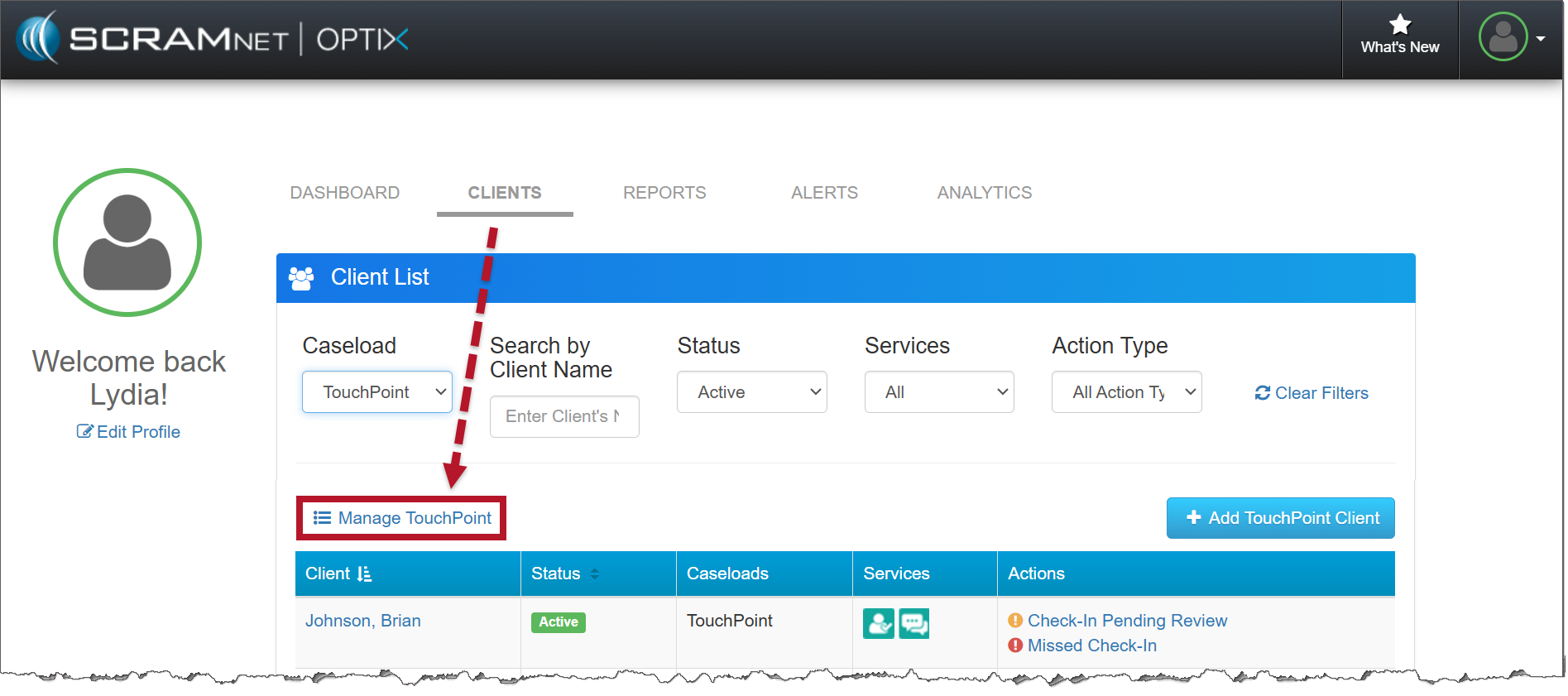 To access this feature, select the Manage TouchPoint link located on the Clients page in Optix, and then click the Messaging tab.