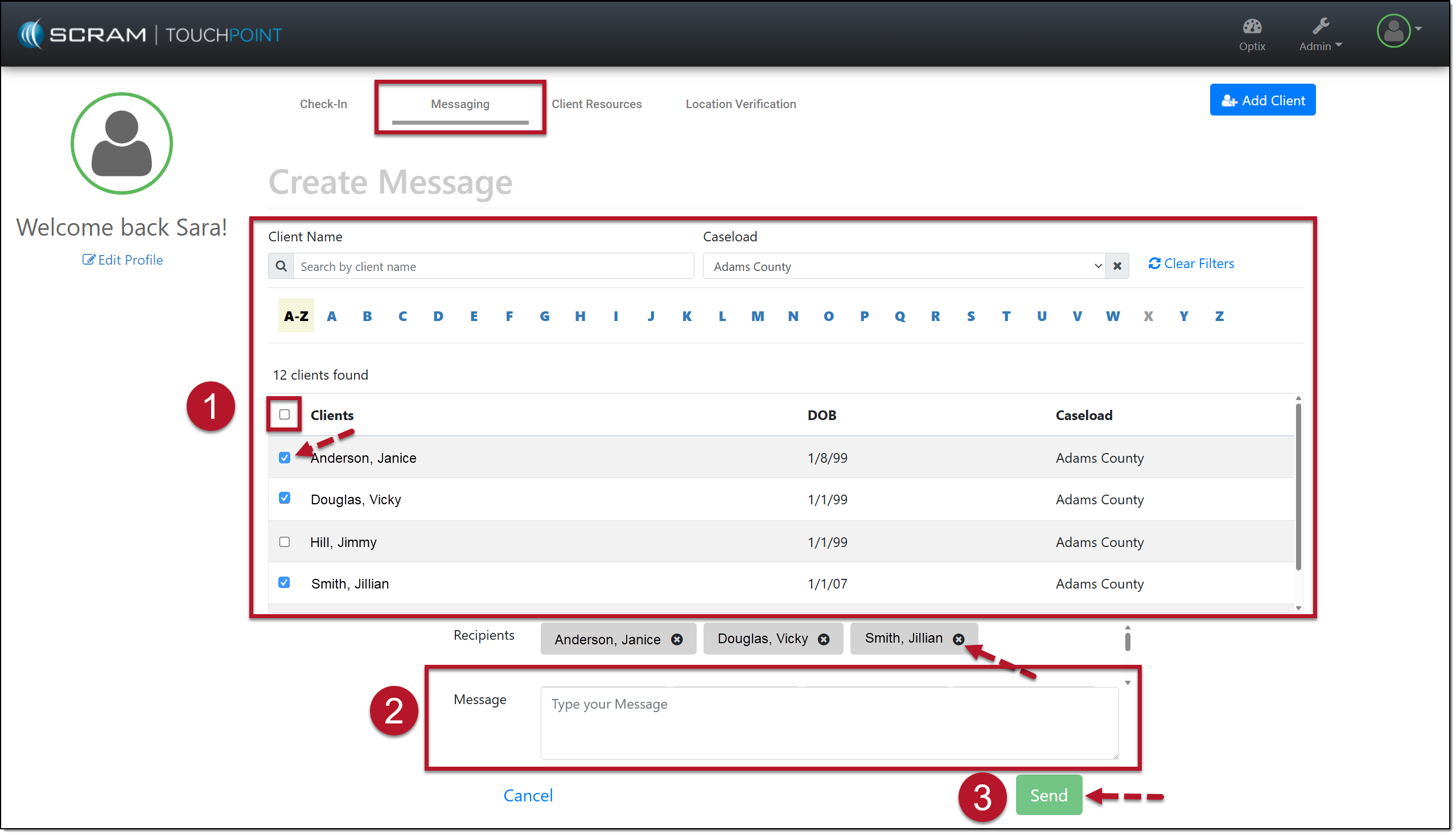 - Each client selected will appear in the Recipients area. If needed, select the x to remove the client from the list.