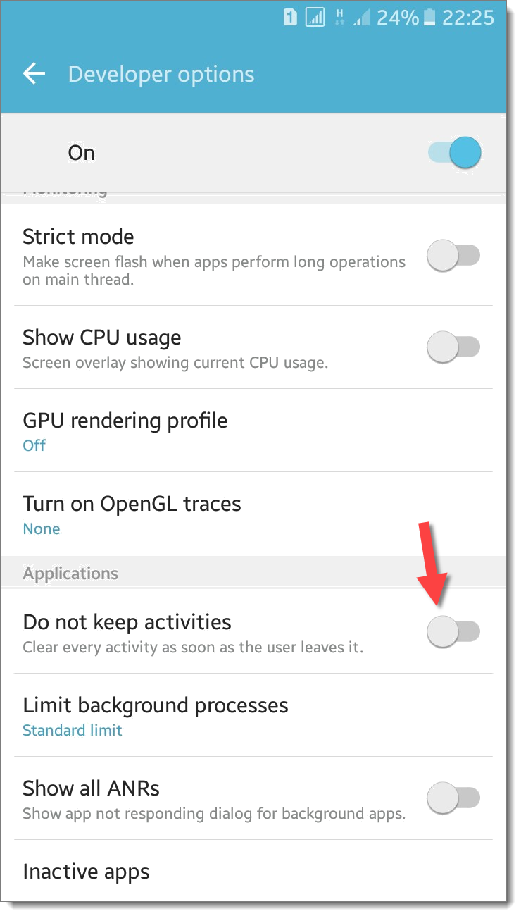 Swipe down to the ‘Do not keep activities’ switch and ensure it is toggled to the “off” position.
