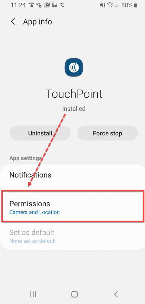 - On the TouchPoint app screen, locate and select Permissions under the App settings section.