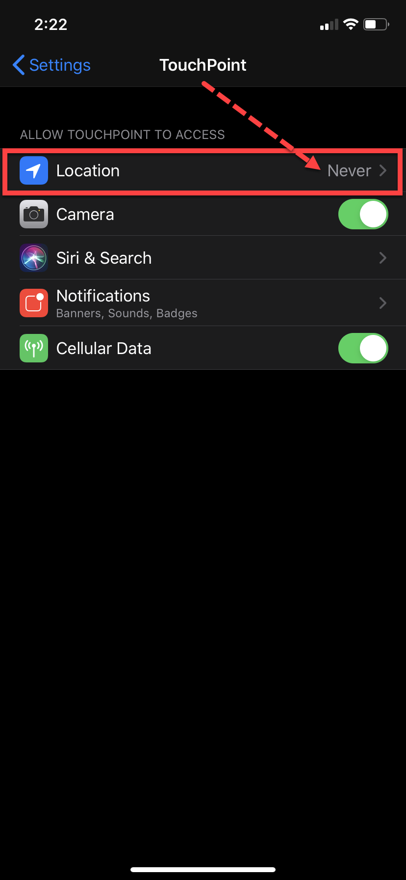 - On the Allow TouchPoint to Access screen, select the Location option.