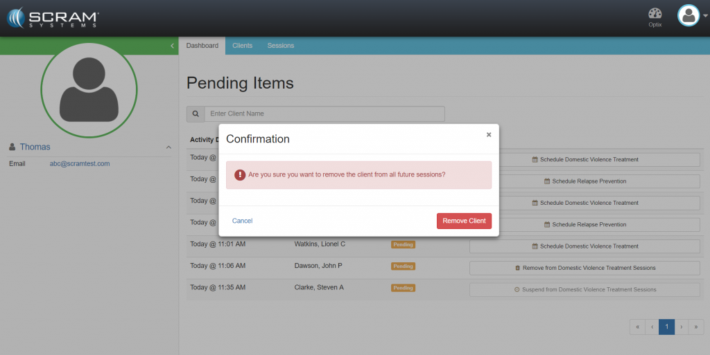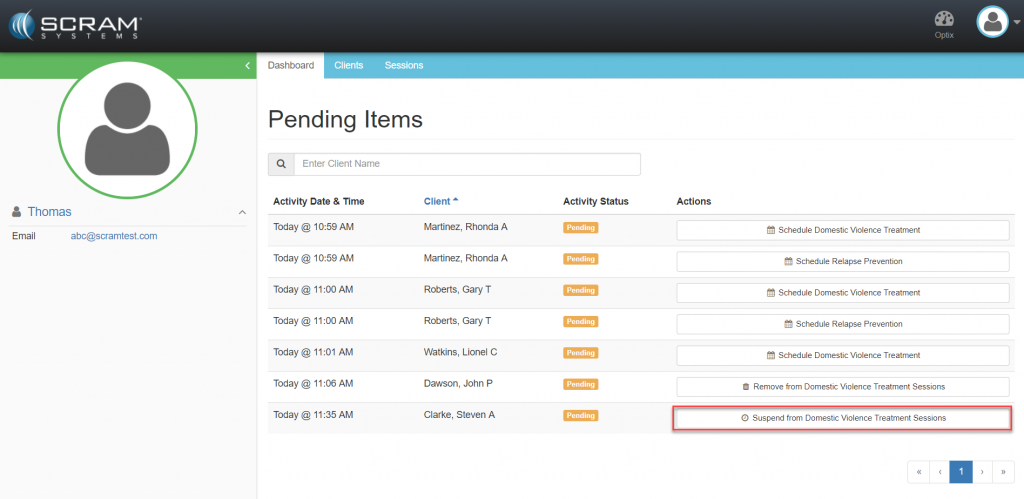 When the Probation Officer suspends a treatment activity in SCRAM Nexus, a Suspend Pending Item is created for the client.
