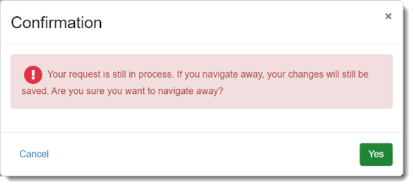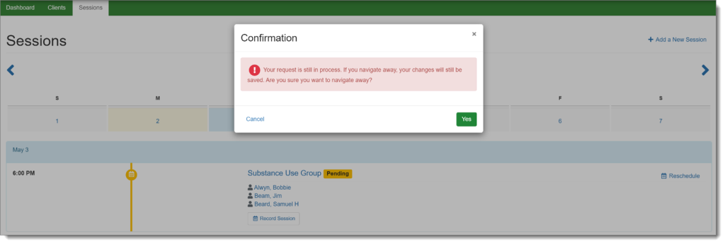 If you save a Session series and then attempt to navigate away from the page, you may receive a warning that your changes are still in process. This warning is intended as a safeguard to prevent you from creating a duplicate Session, or from making additional changes to the existing Session before the prior change is complete.