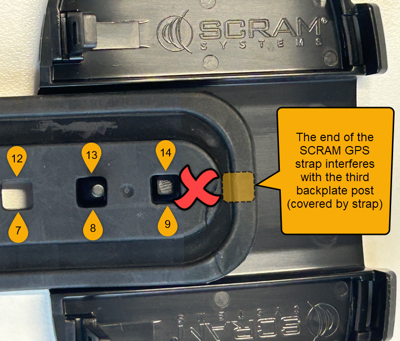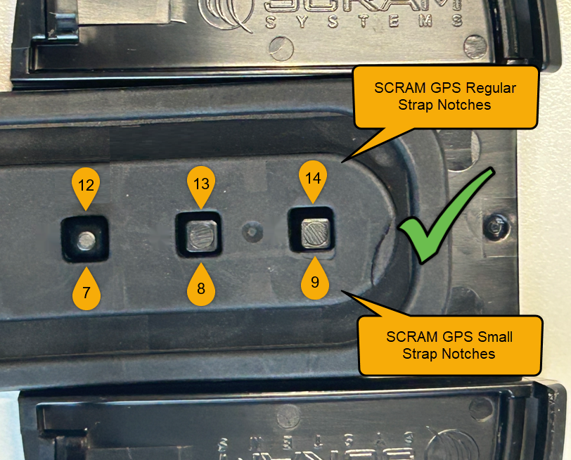 | IMPORTANT! There are nine sizing notches in a “small” (sometimes referred to as “juvenile”) SCRAM GPS strap, and 14 sizing notches in a “regular” (adult) SCRAM GPS strap. Ensure that the three raised pegs in the backplate fit into three of the available sizing notches in the strap. DO NOT attempt to secure the strap on only the last two notches of the strap (8 & 9 for small, or 13 & 14 for regular); otherwise the backplate will not close flush against the device casing and may result in tamper alerts being generated in SCRAMNET GPS. |