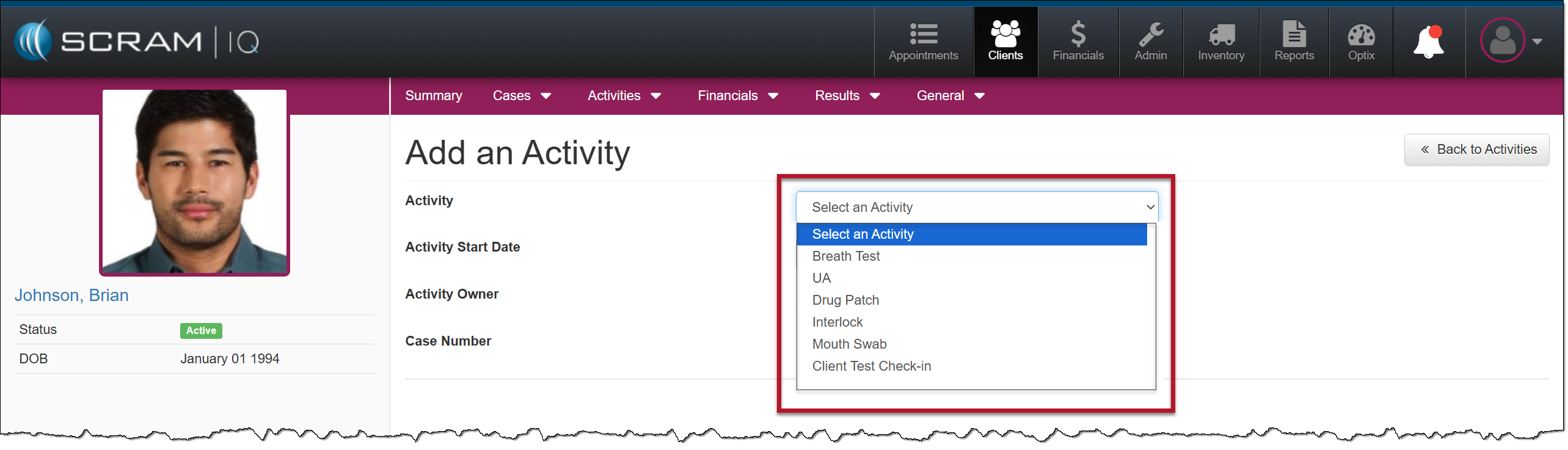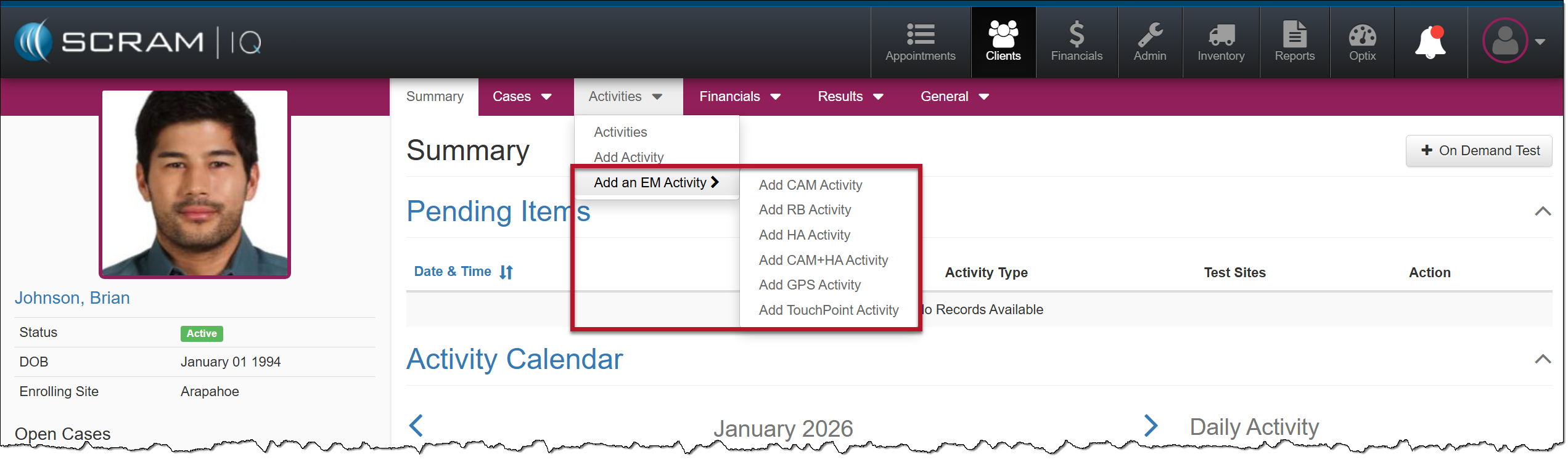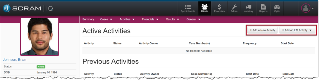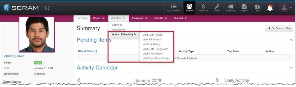 | Tip: The available Activity options will reflect the activities currently active in your program and the EM Activities you have access to. Additionally, if an Activity is currently active for the client, that option will NOT appear in the dropdown menu. |