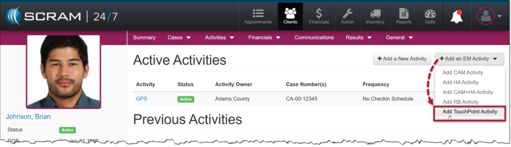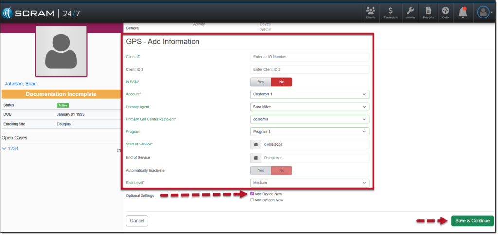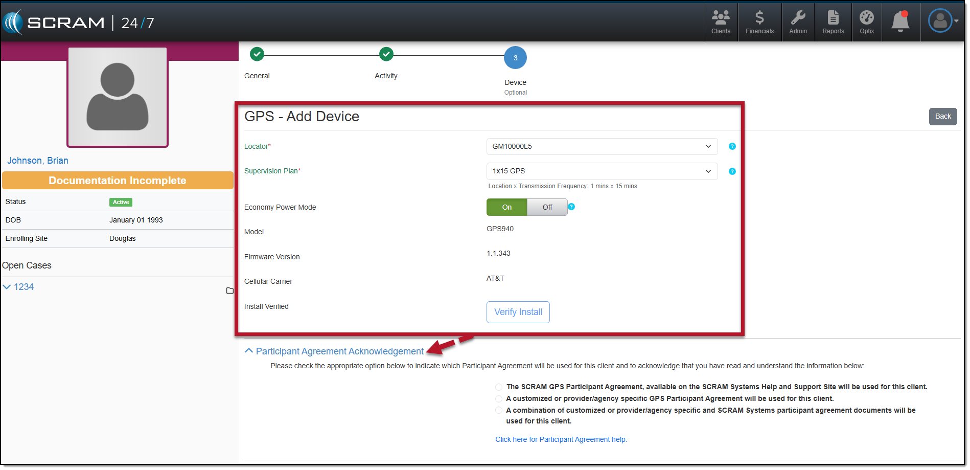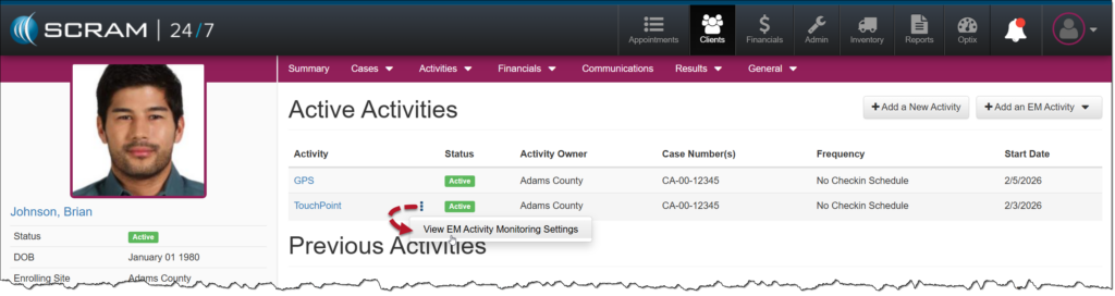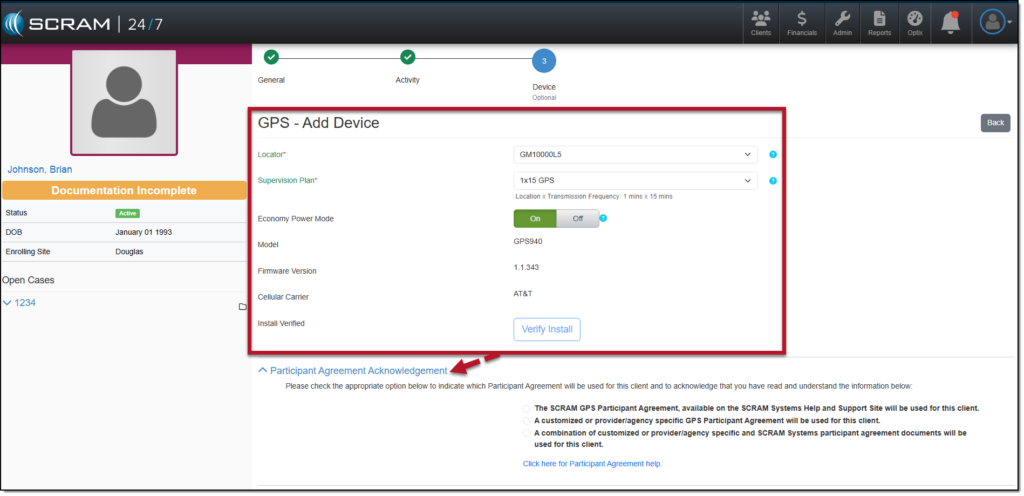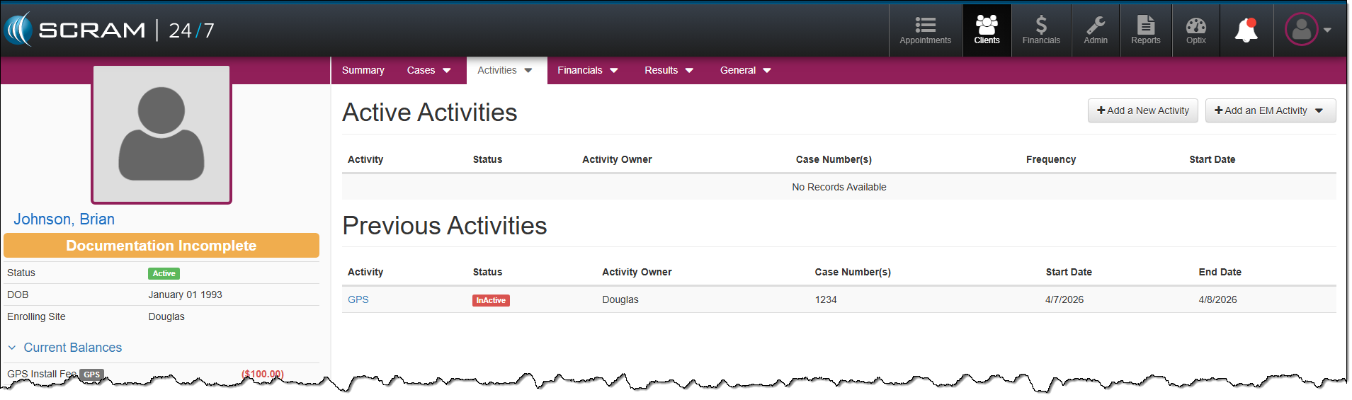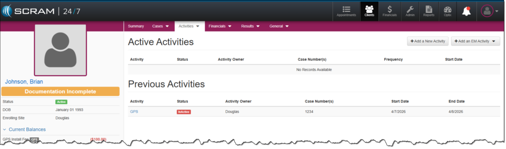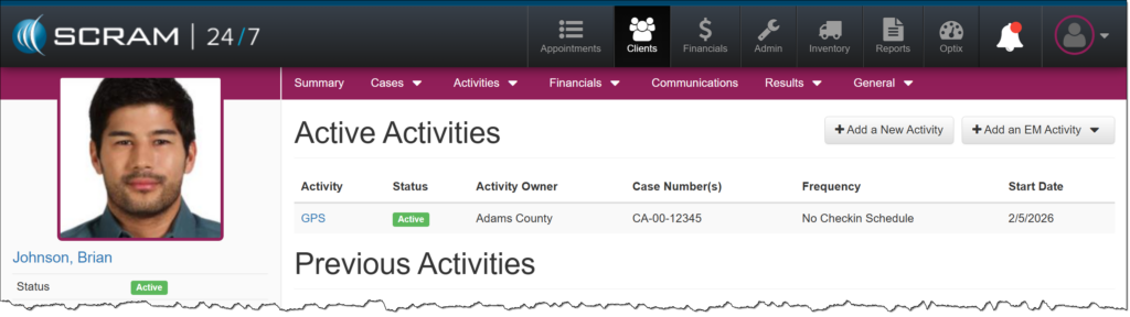 Once you have created the client’s profile in SCRAM 24/7, the next step is to add the GPS Activity and then complete the equipment assignment.