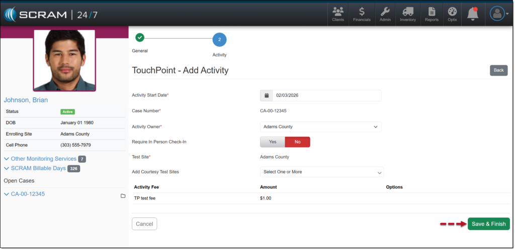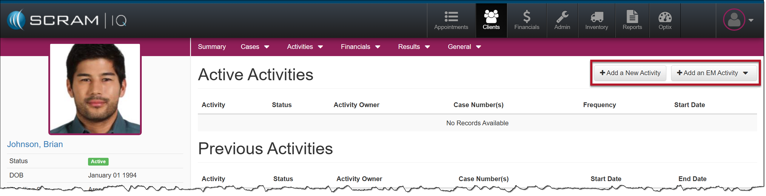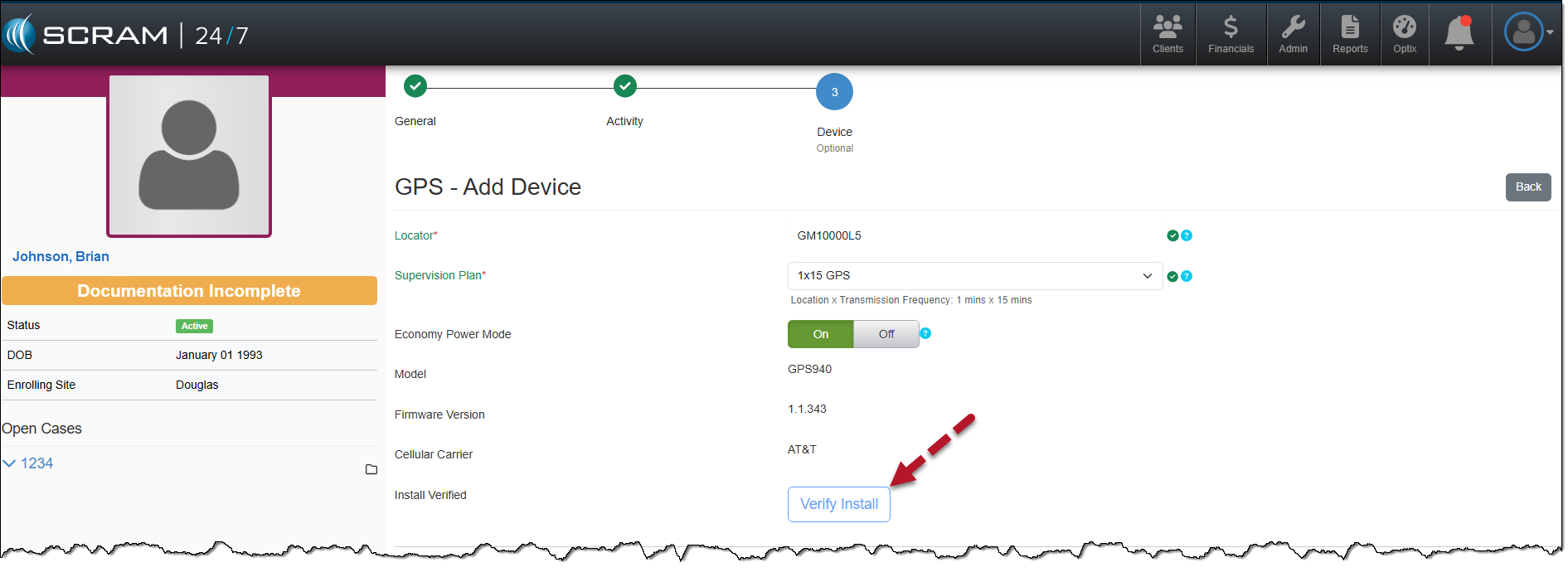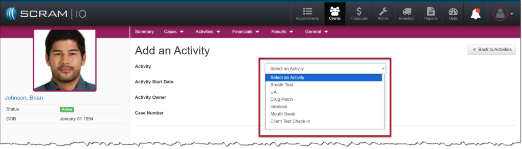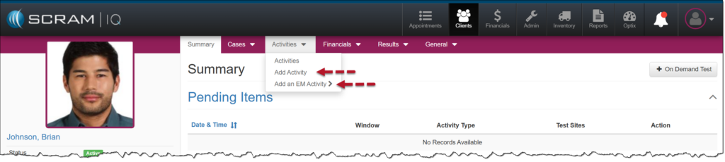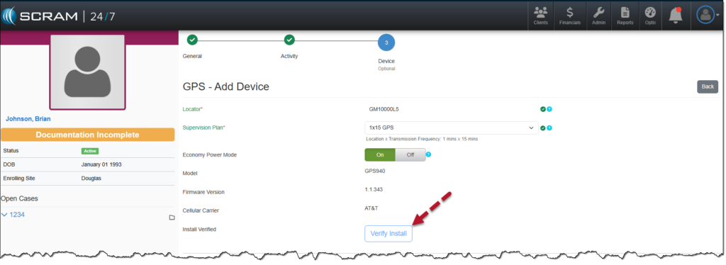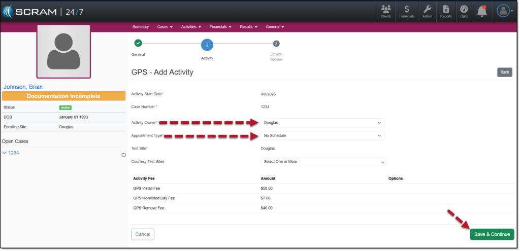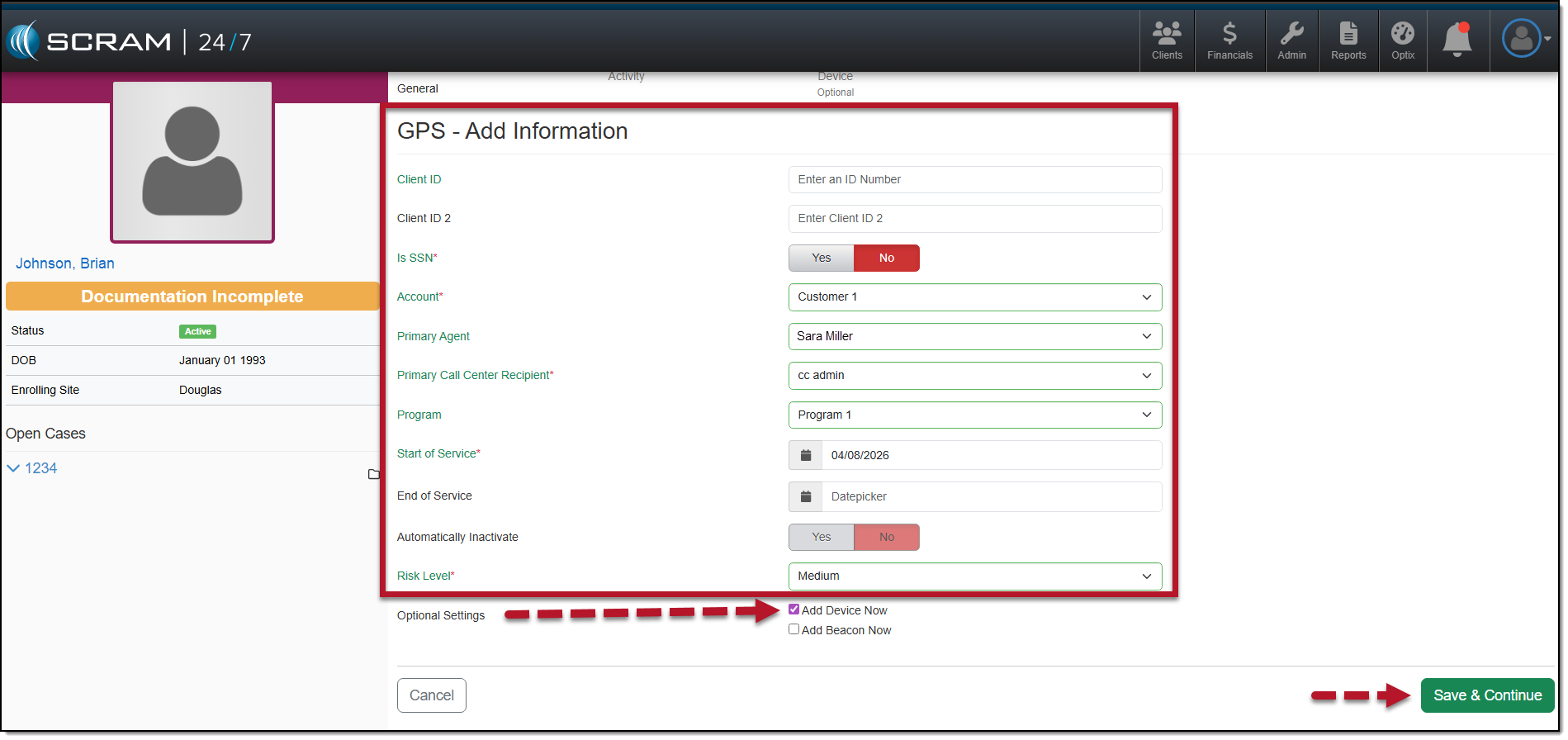 Once you have created the client’s profile in SCRAM 24/7, the next step is to add the GPS Activity and then complete the equipment assignment.