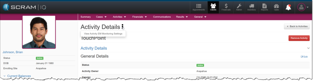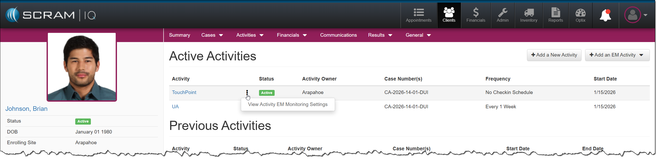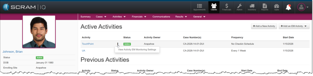 Once an EM Activity is active for a client, you may view their EM Monitoring Settings by selecting the ellipsis next to the Activity on the Active Activities page or the Activity Details page and then the View Activity EM Monitoring Settings option.