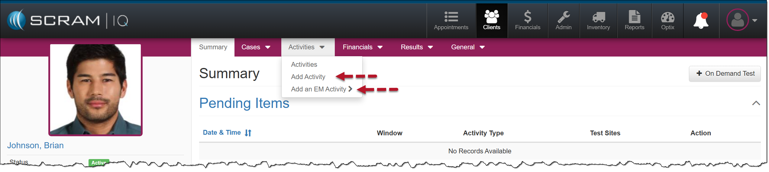 There are two additional options available on the Activities tab dropdown menu: Add Activity and Add an EM Activity. These two options separate the EM-related activities from the non-EM-related activities.