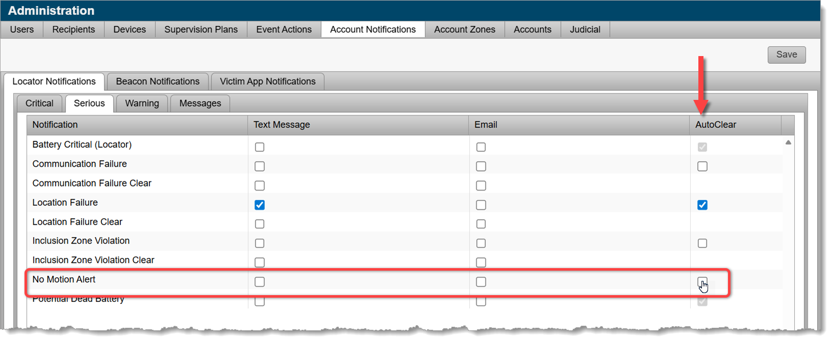 Administrators can enable this feature by selecting the No Motion Alert “AutoClear” checkbox in Account Notifications.
